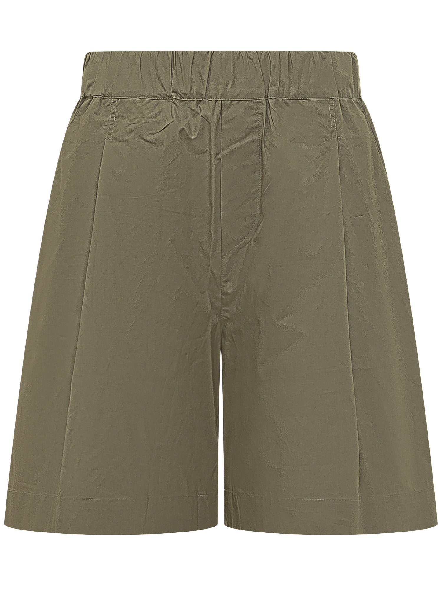Popeline shorts with elasticated waistband and front closure. Wide knee length leg and straight silhouette. Minimal design with vertical seams and finished hem.
