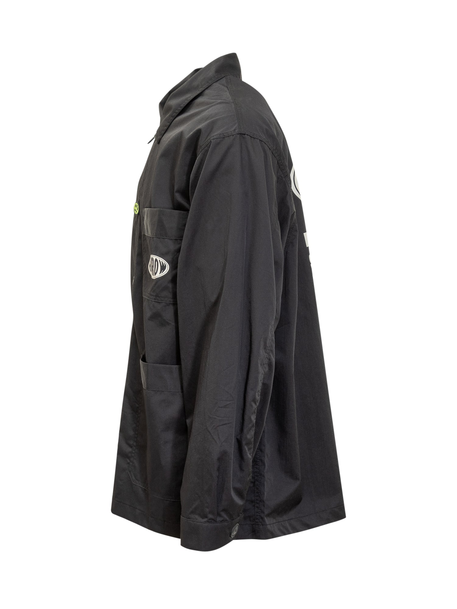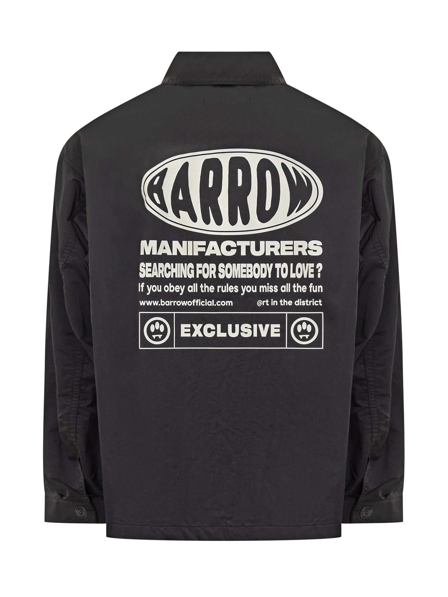 Black jacket. Classic collar. Print on the back. Front pockets. Logo printed on the chest. Button fastening.