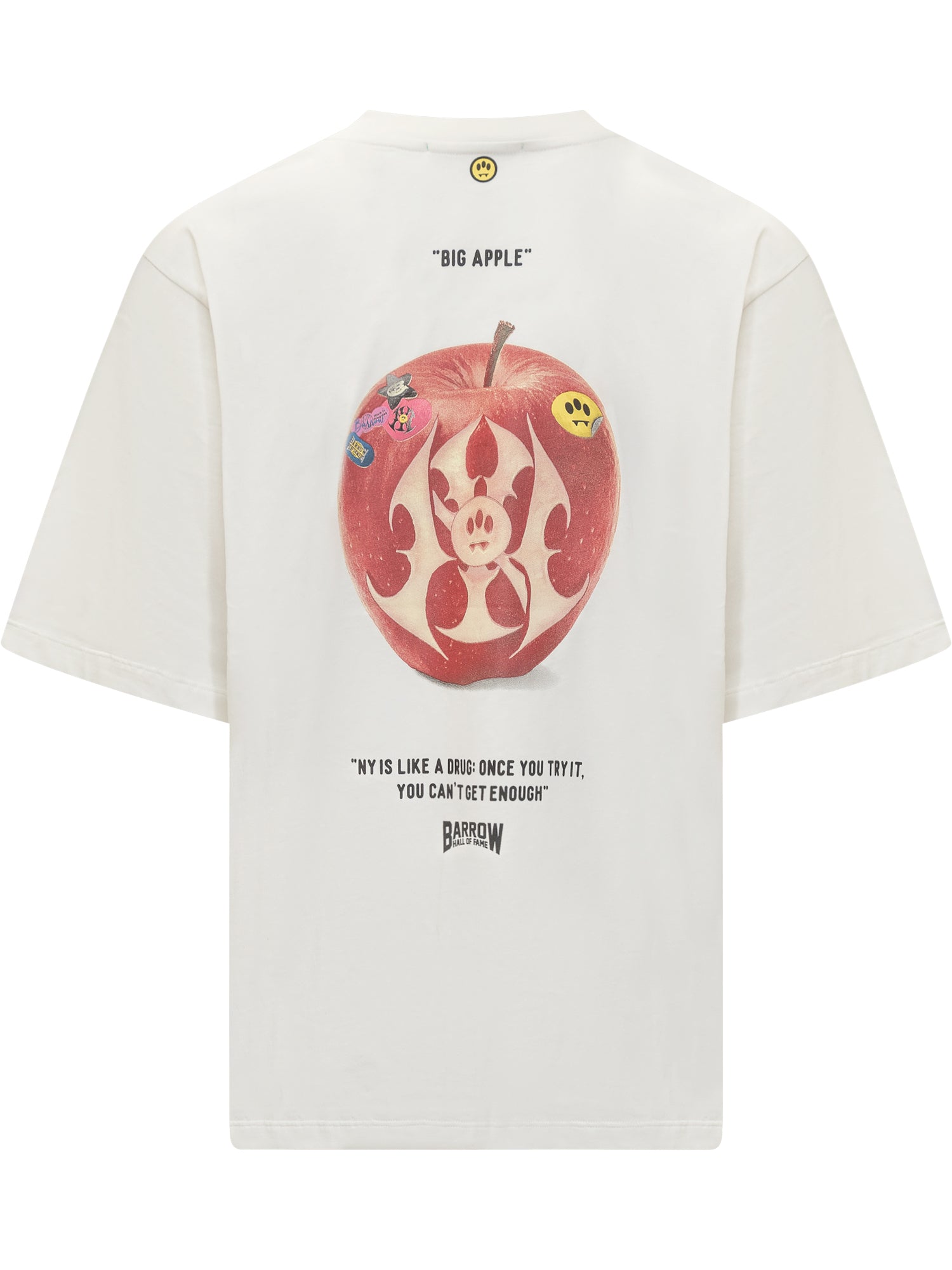 White cotton T-shirt with tribal-style graphic and Barrow neon smiley logo on the chest. Oversized fit, ideal for bold streetwear looks.