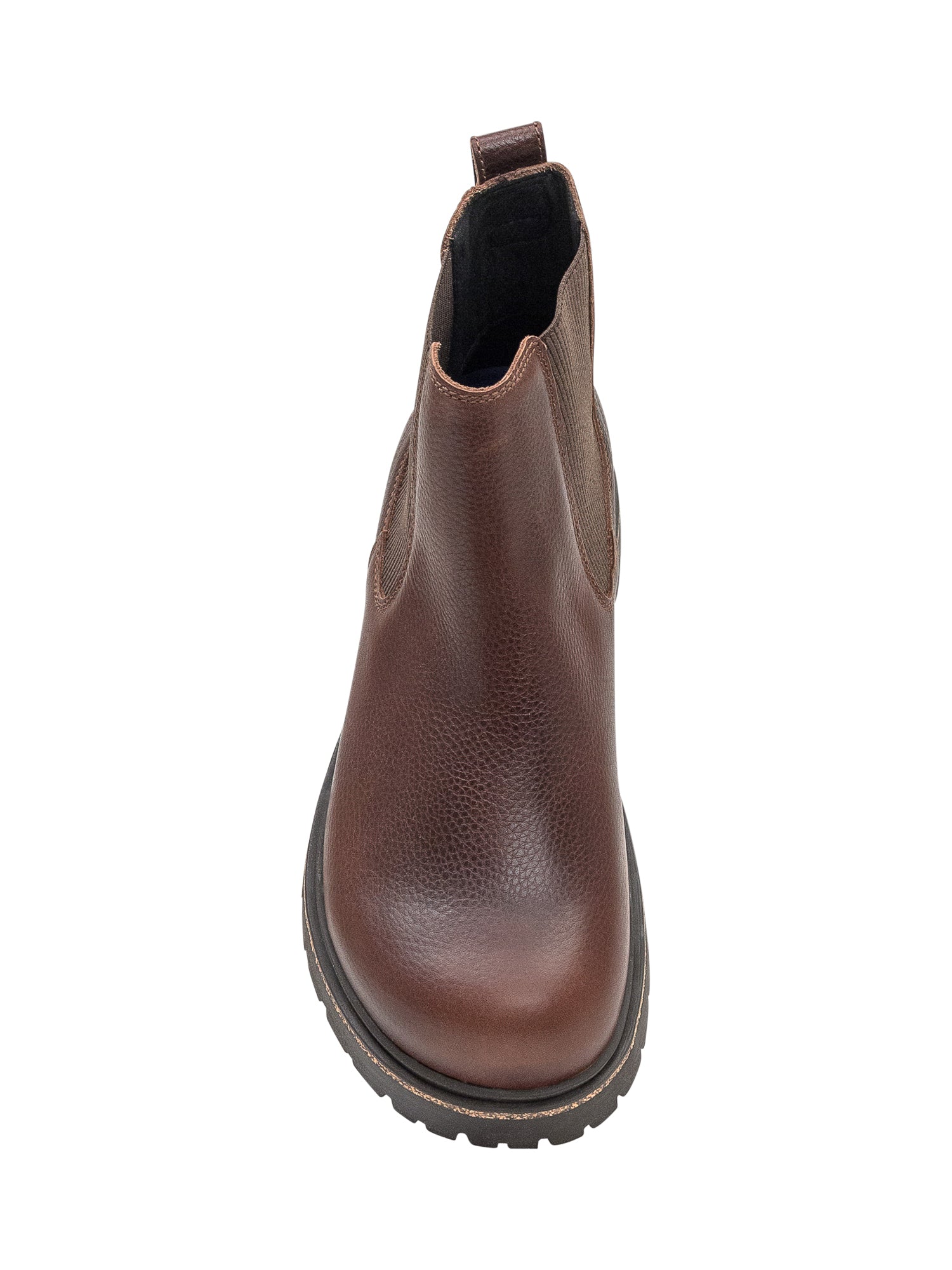 Brown Chelsea boot by Birkenstock crafted in grained leather with side elastic inserts and chunky lug sole.