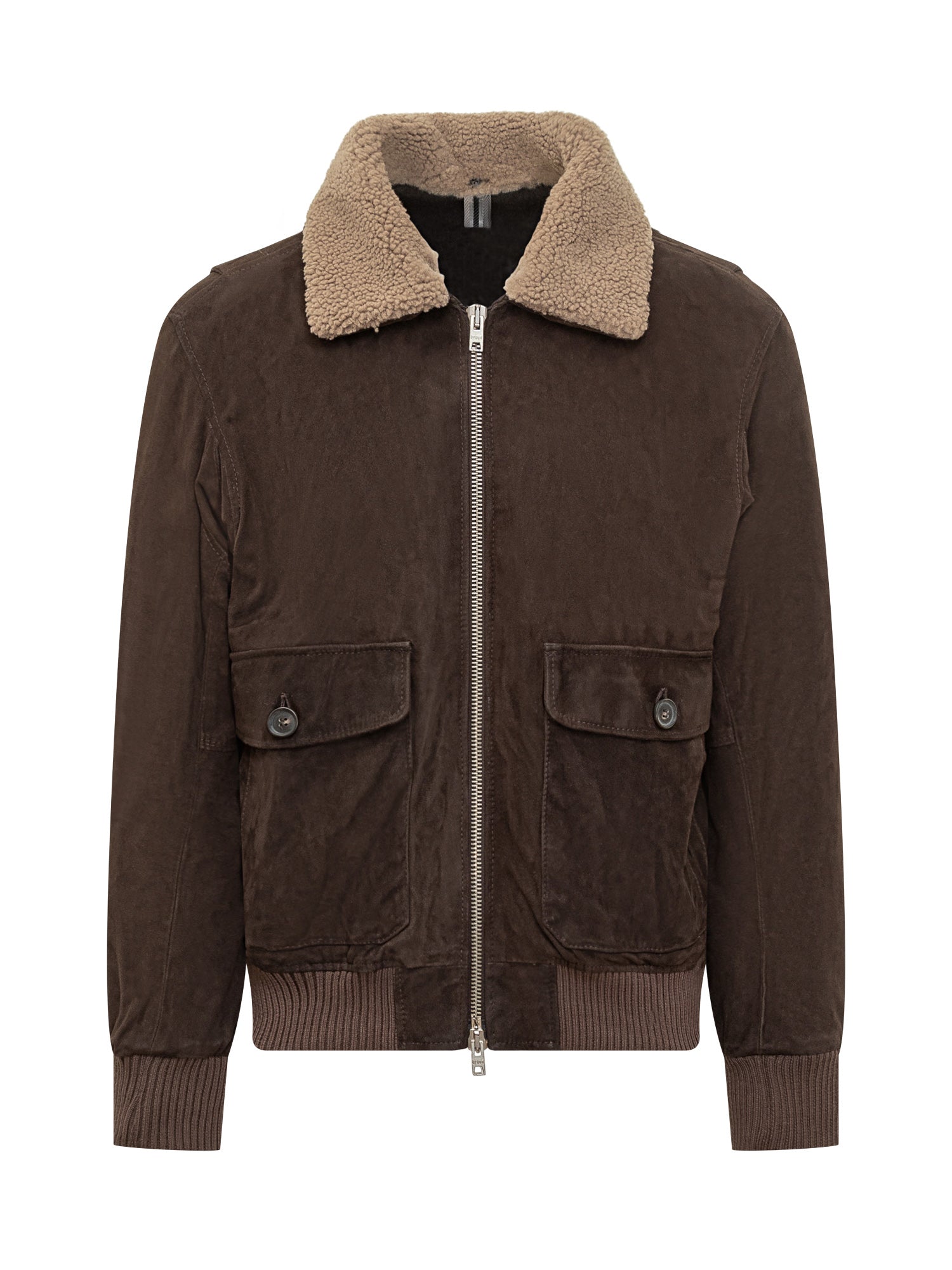 Dfour brown suede shearling jacket with contrasting shearling collar, flap front pockets and double-slider zip.