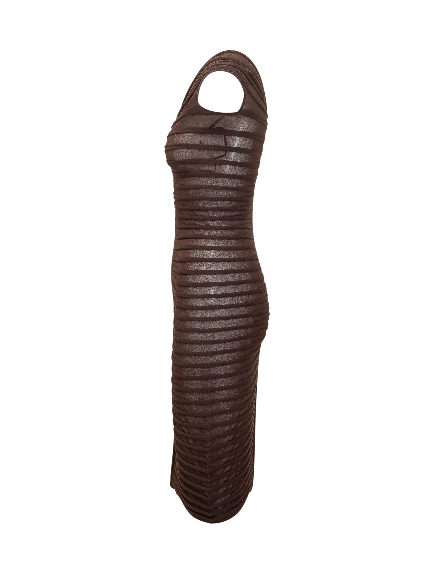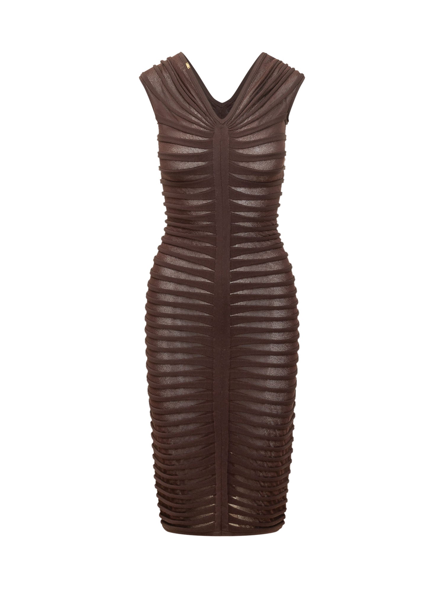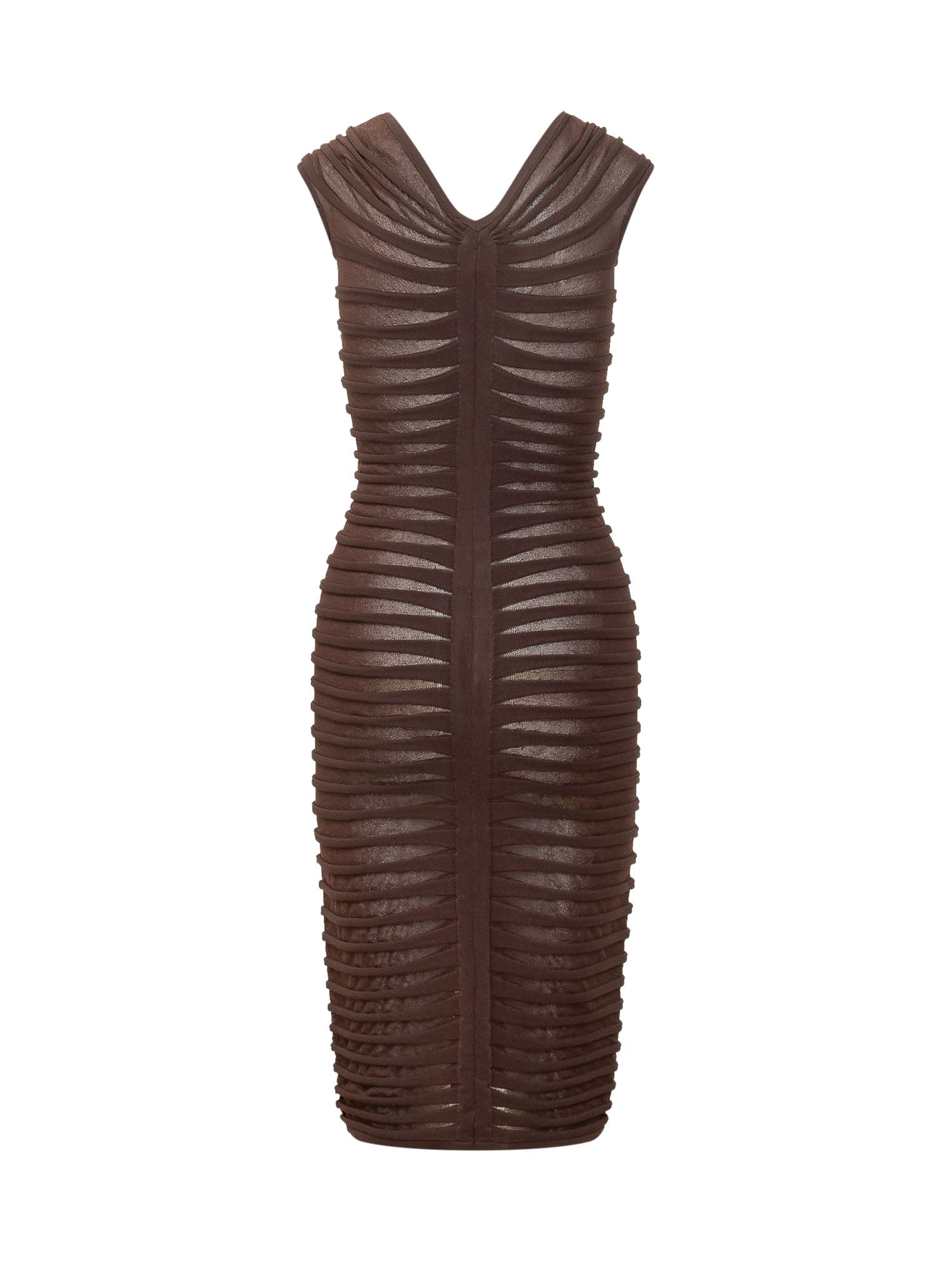 Fitted midi knit dress featuring draped construction with horizontal ribbed detailing that enhances the silhouette. Designed with a V-neckline and structured shoulders for an elegant and contemporary look.