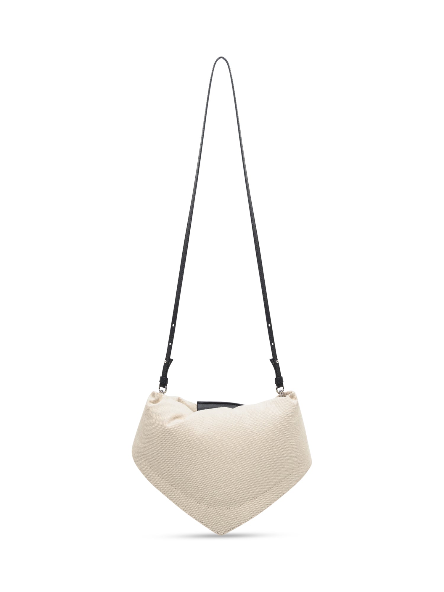 White bag in fabric. A handle. Removable shoulder strap. Closure on the back with zip. Internal padding.