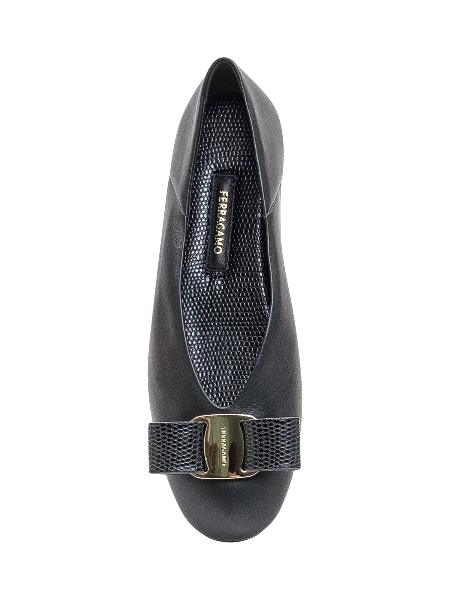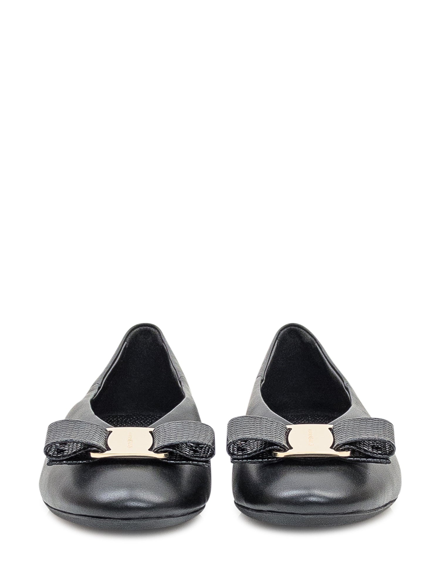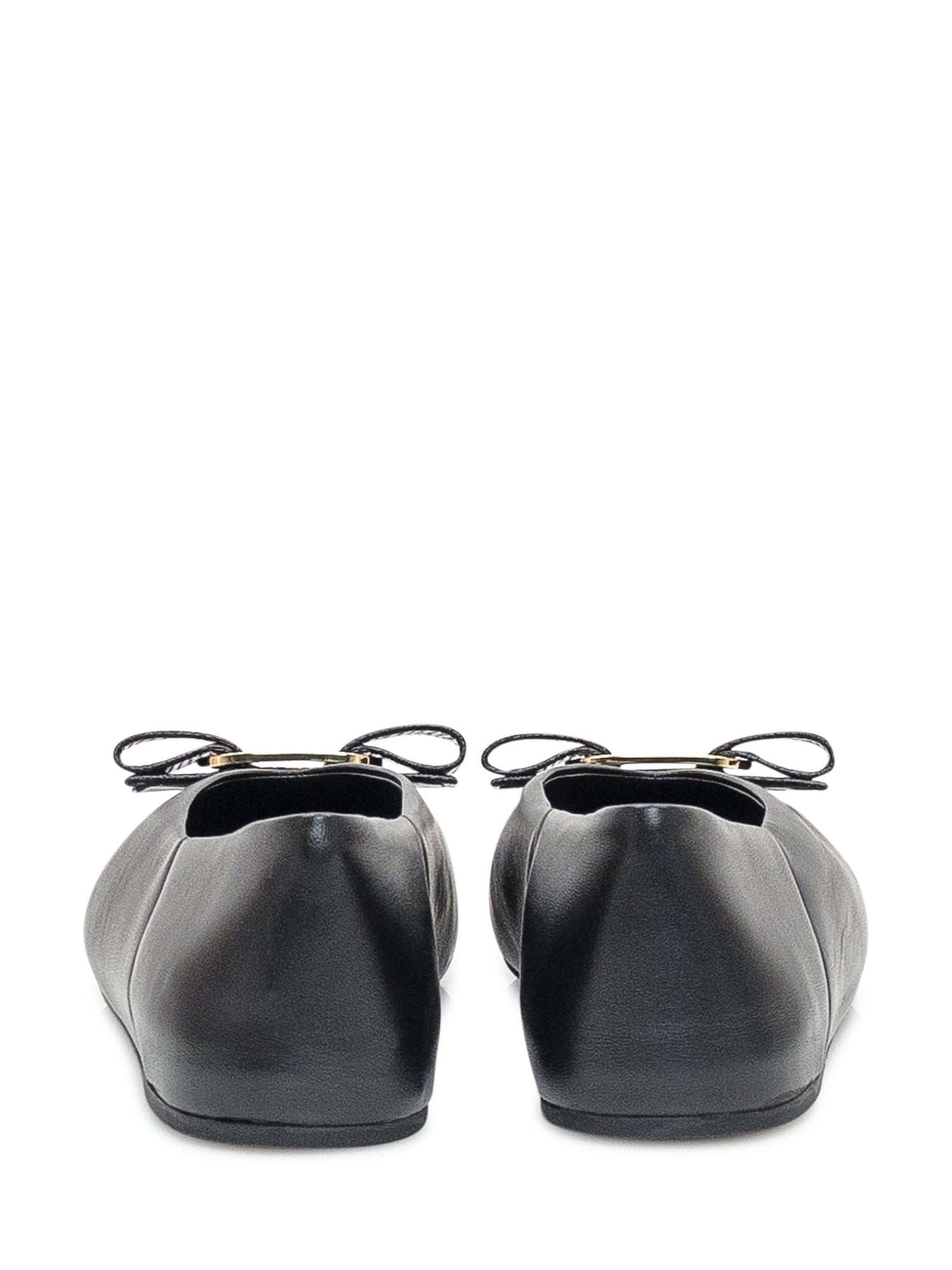 Elegant Ferragamo black leather ballet flats with the iconic bow and gold-tone detail.