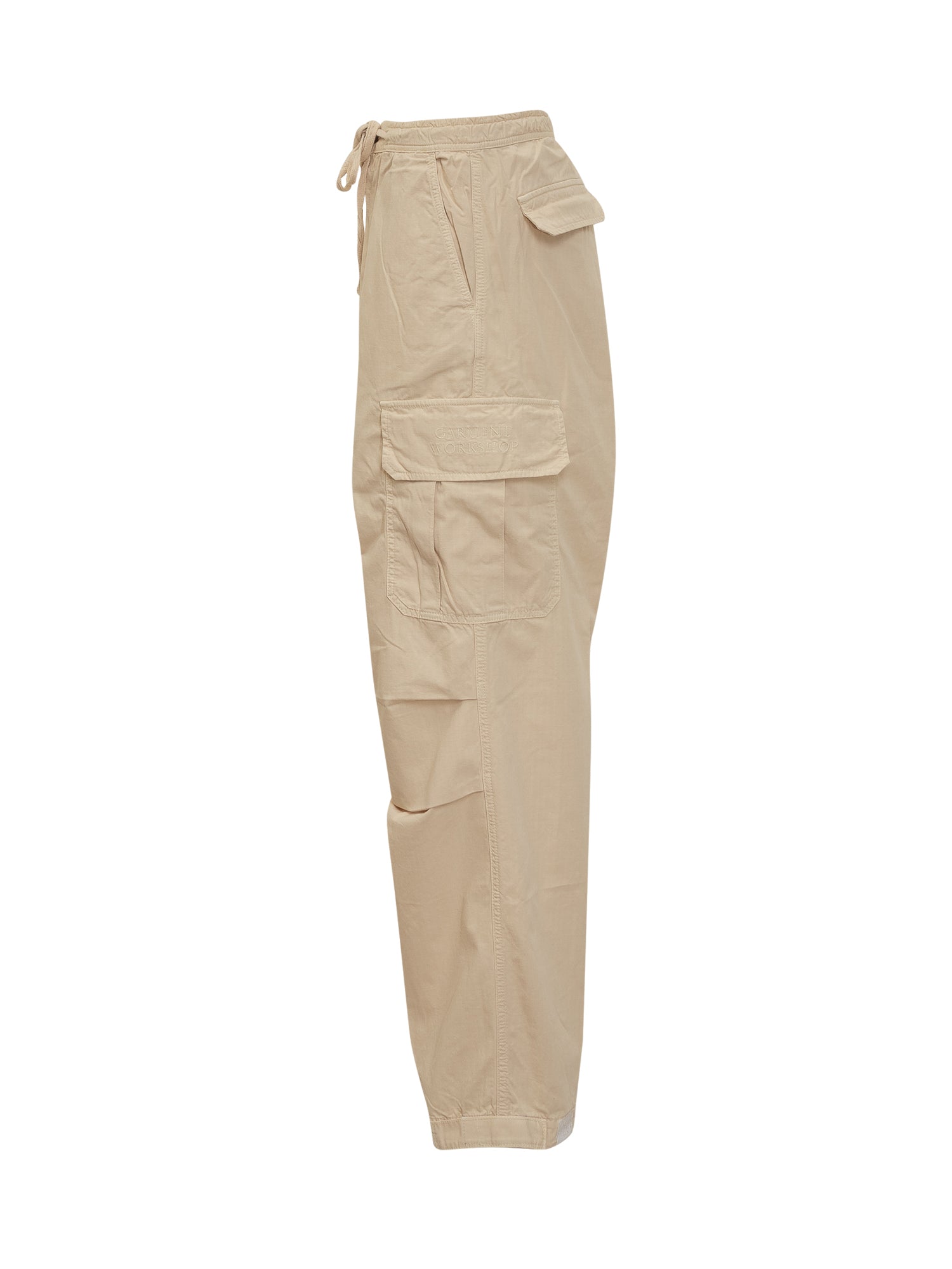 Beige cotton trousers. Cargo model. Flap pockets. Zip, button and drawstring closure. Adjustable bottom width.