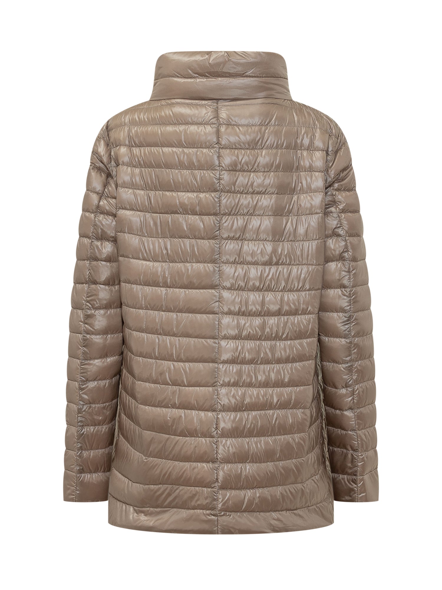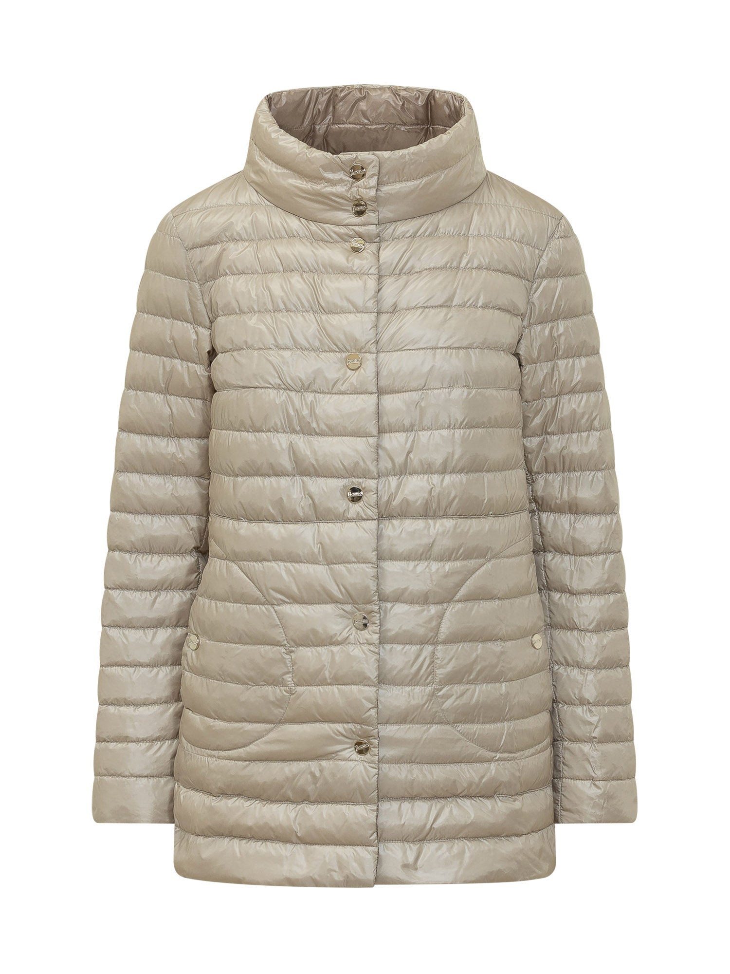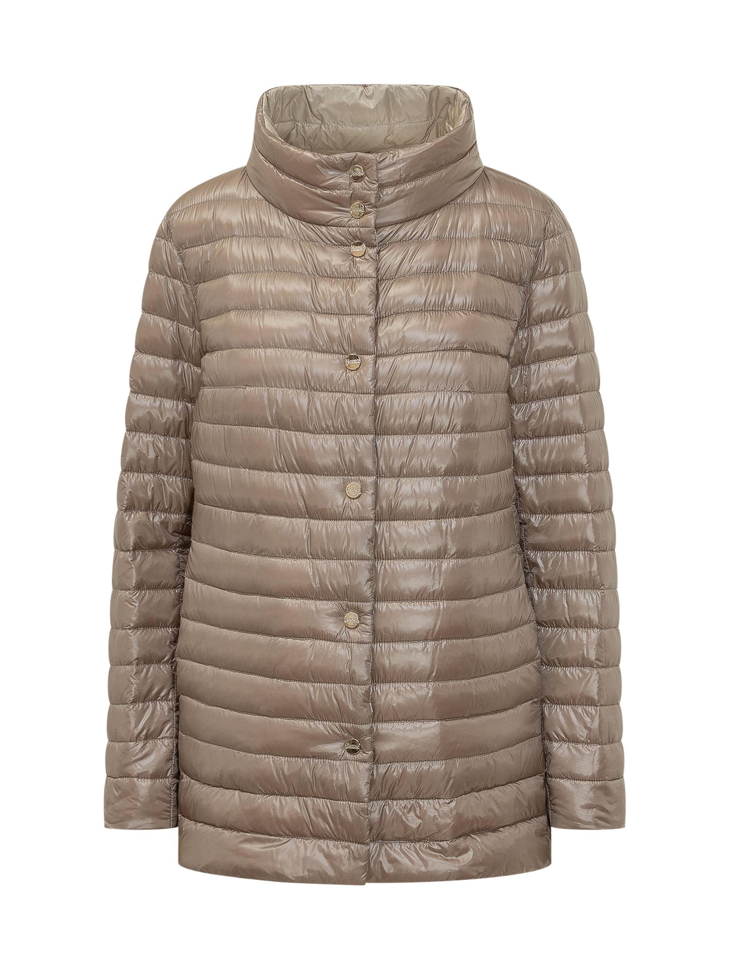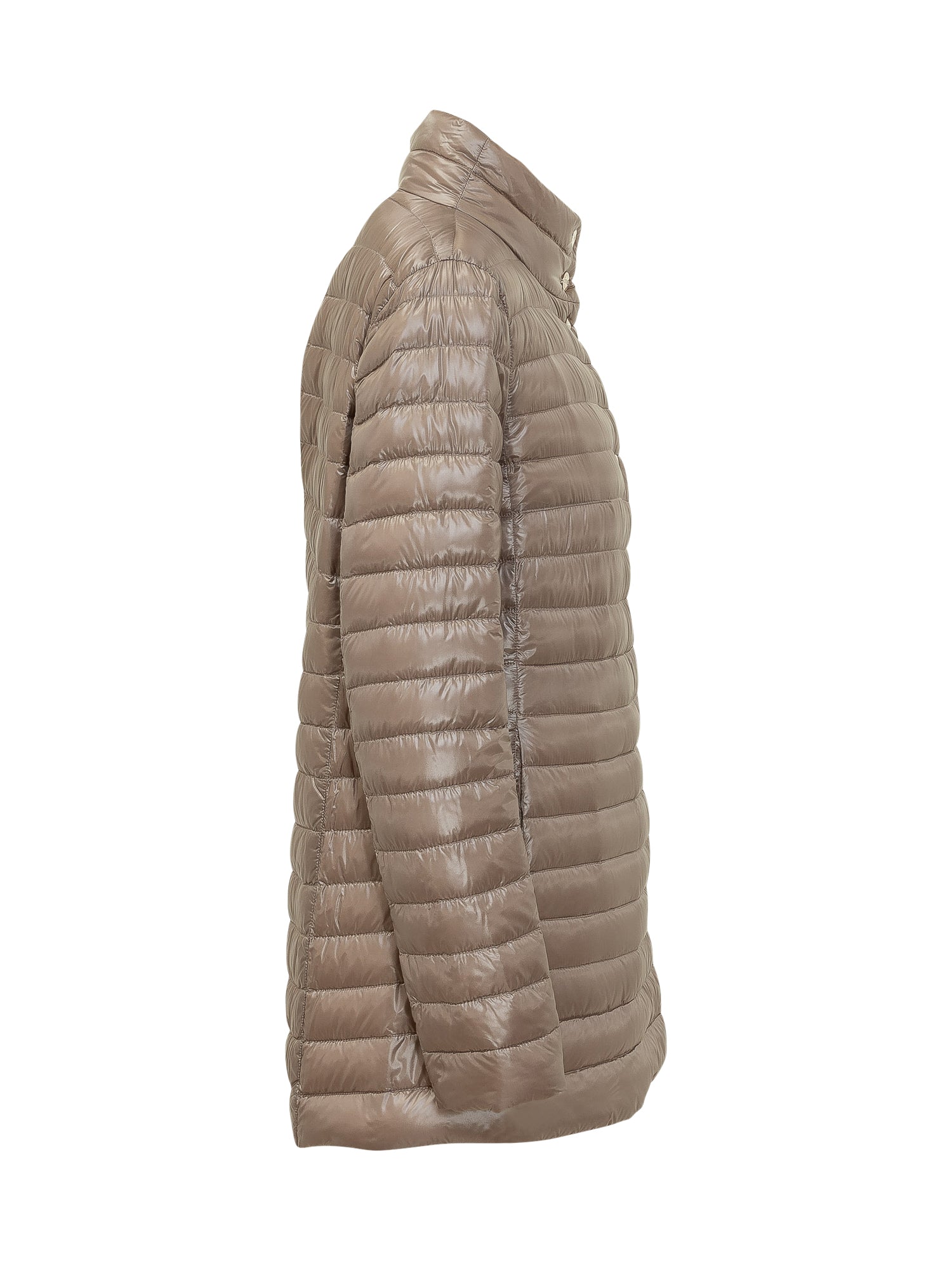 Lightweight mid-length quilted down jacket with protective high collar and button closure. Minimal design and feminine silhouette.