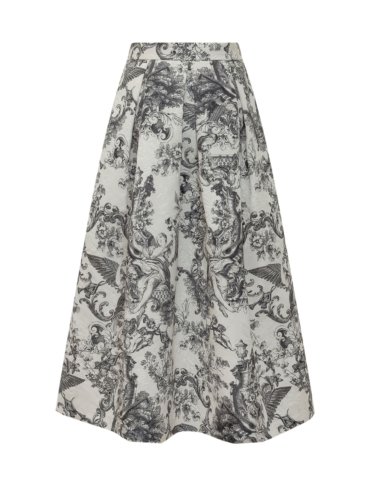 Full skirt with waist pleats and toile print with all over figurative scenes. Midi length with generous volume and structured construction. Designed for refined looks with bold character.
