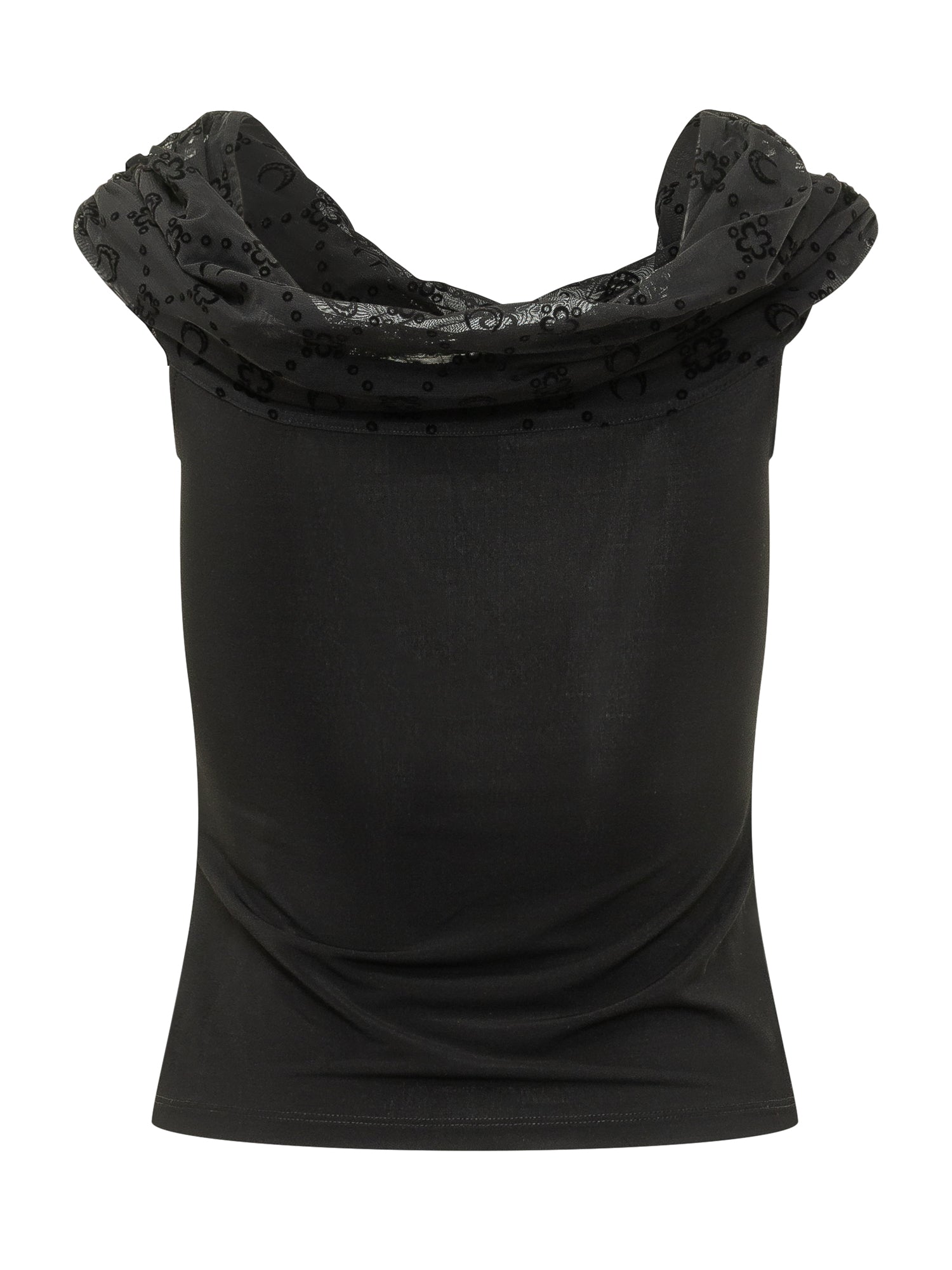 Jersey bustier top with draped neckline and off shoulder design. Fitted silhouette with soft structure.