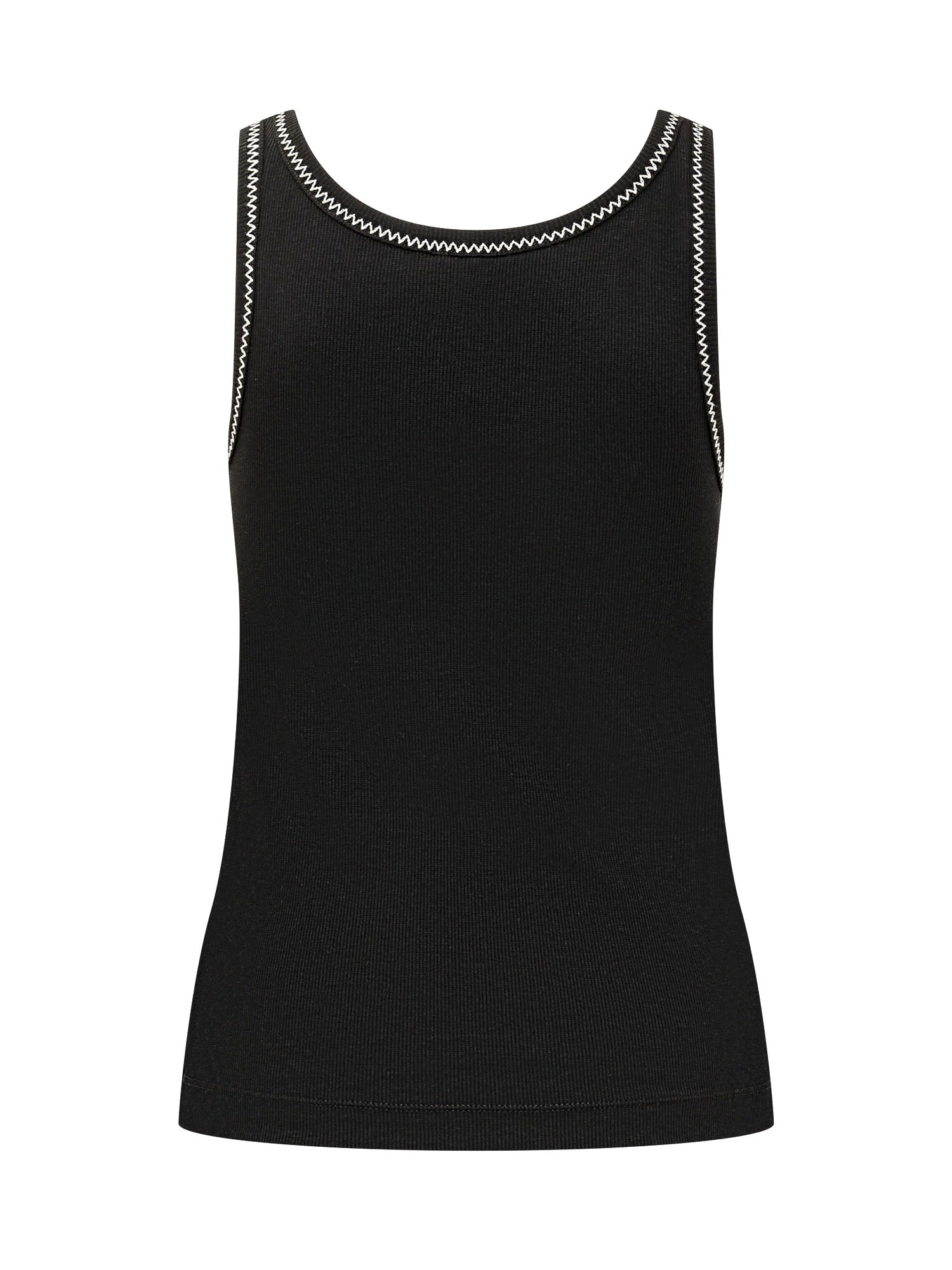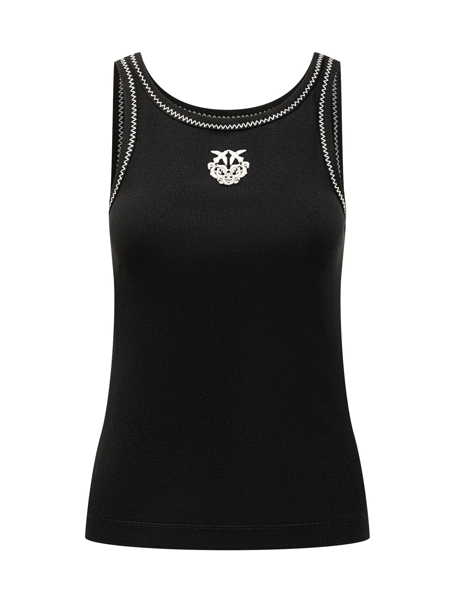 Fitted ribbed tank top with a clean and contemporary design. It features a round neckline with contrasting trim and decorative stitching along the straps. An elegant embroidered logo on the chest adds a distinctive touch. Perfect to wear on its own or layered under jackets and cardigans for casual-chic looks.