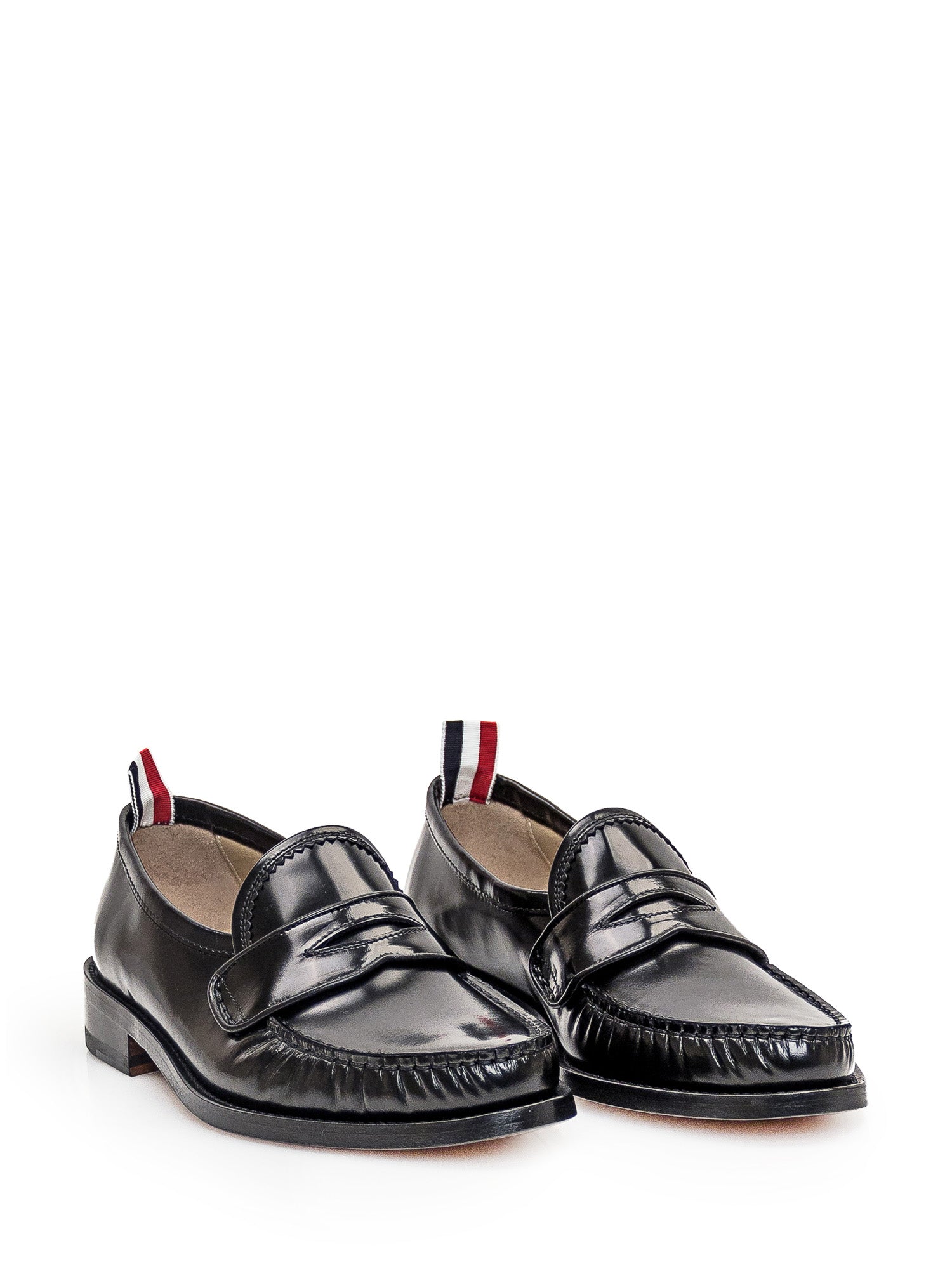 Black leather loafer. Slip-on. Leather mask. Striped grosgrain tongue on the back.
