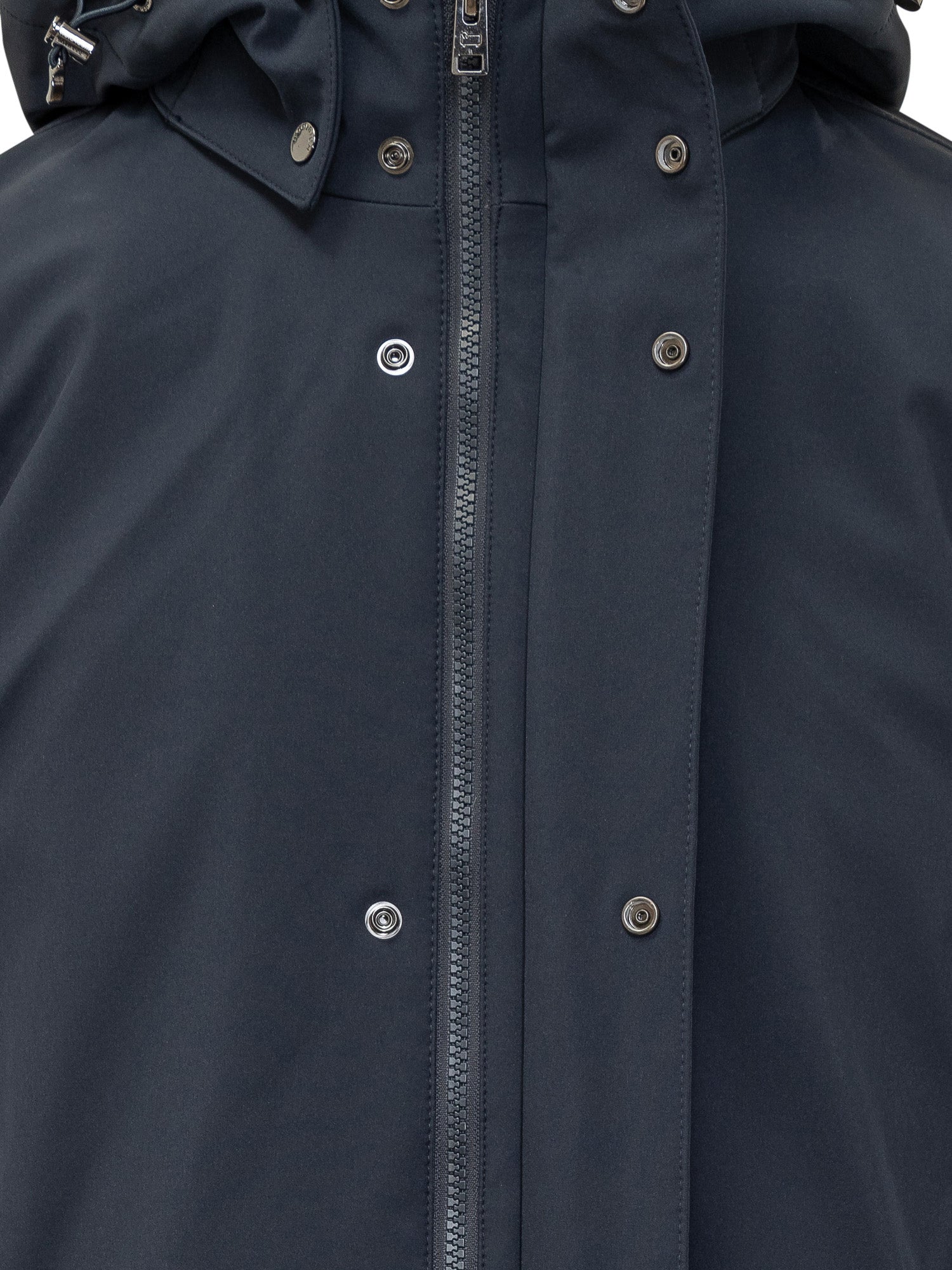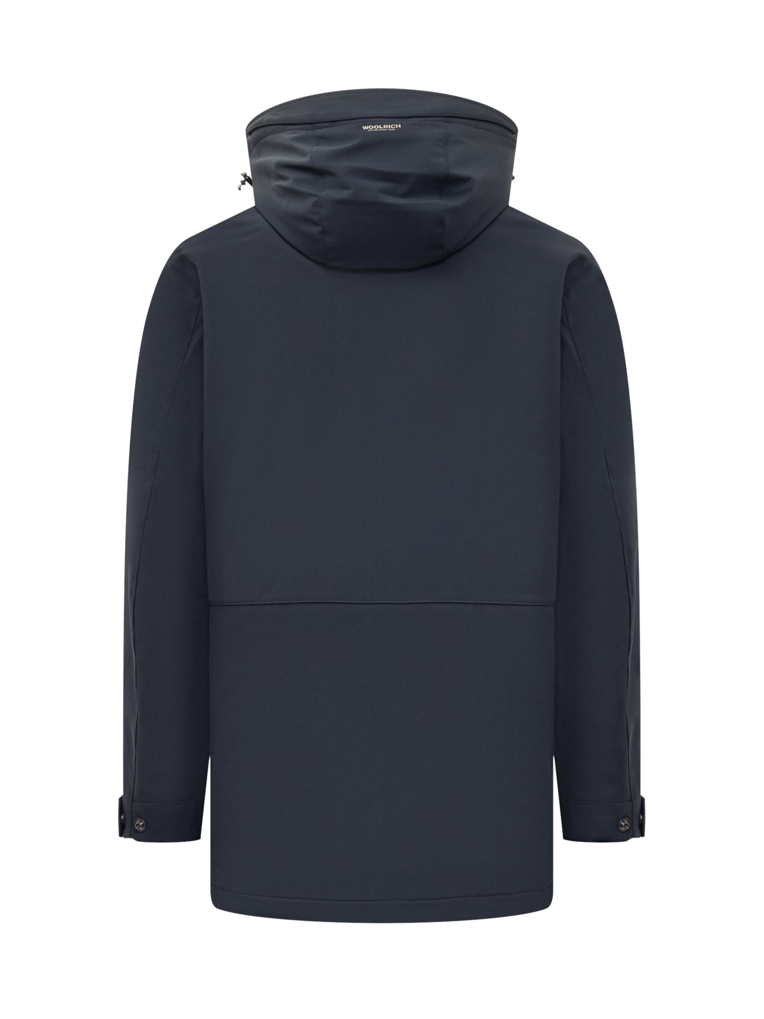 Woolrich blue soft shell coat with adjustable hood, zip and snap button closure. Waterproof technical fabric and modern silhouette for a sleek.