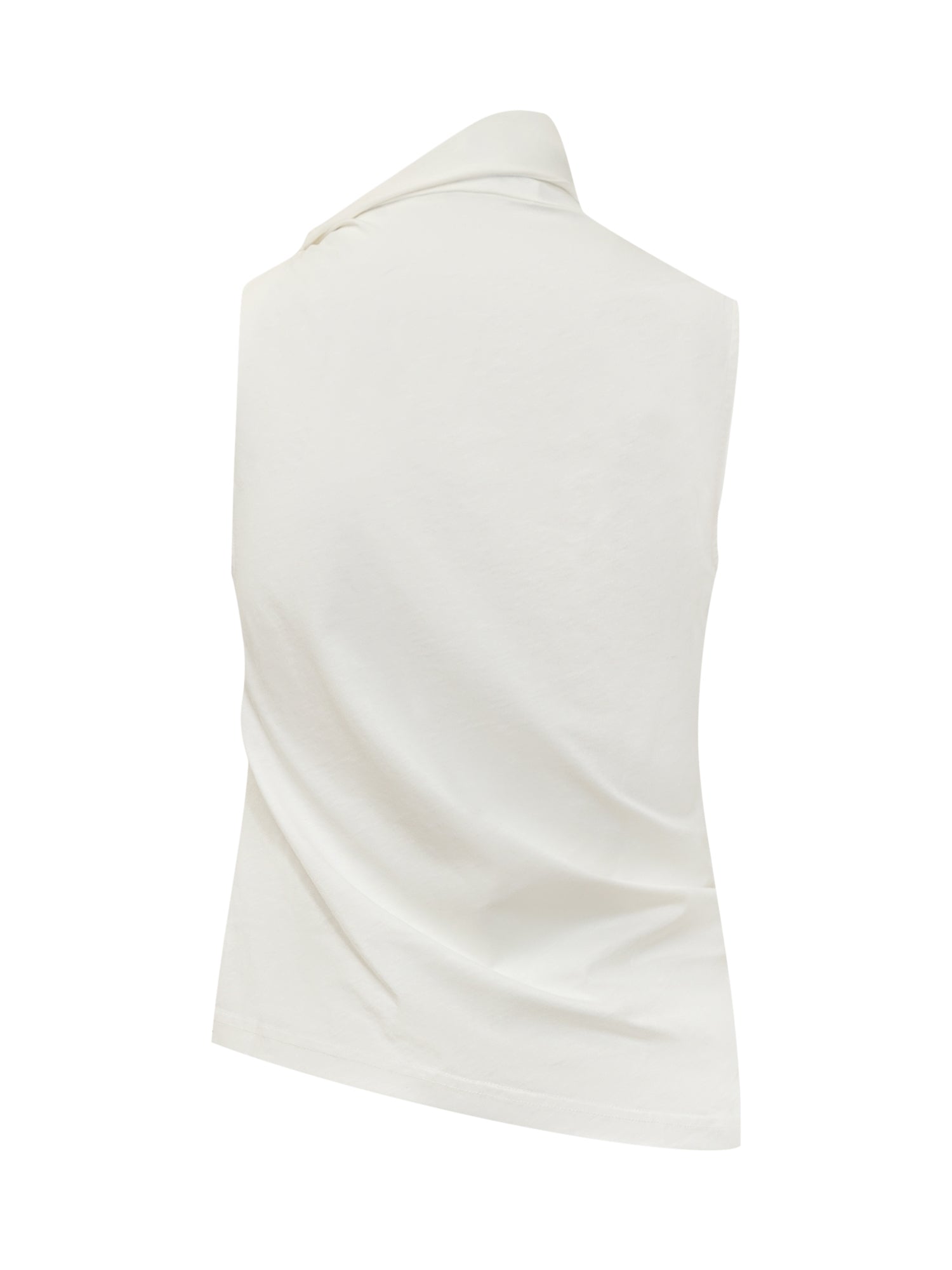 High collar. Sleeveless.