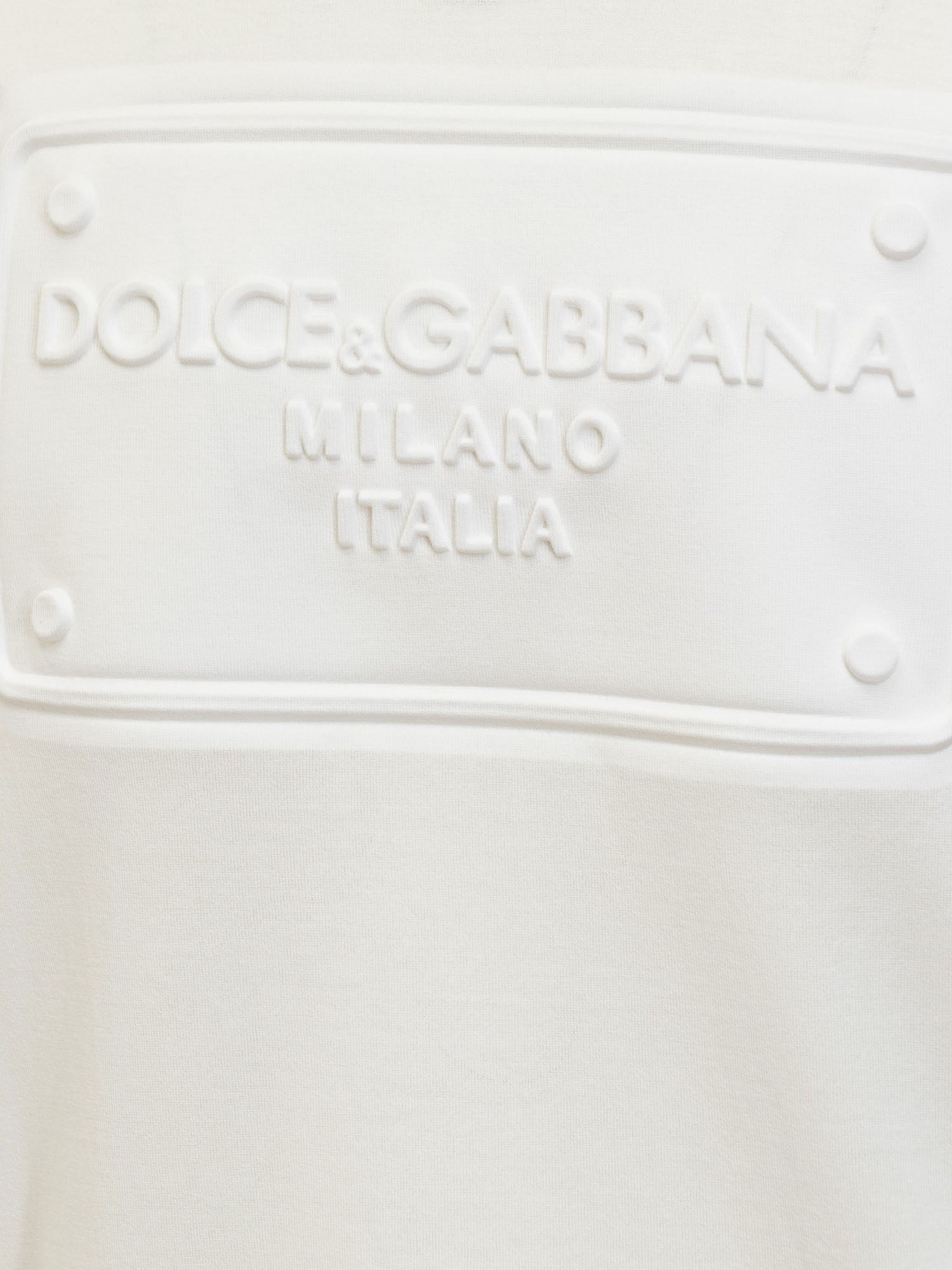 White T-shirt. Short sleeves. Crew neck. Embossed logo on front.