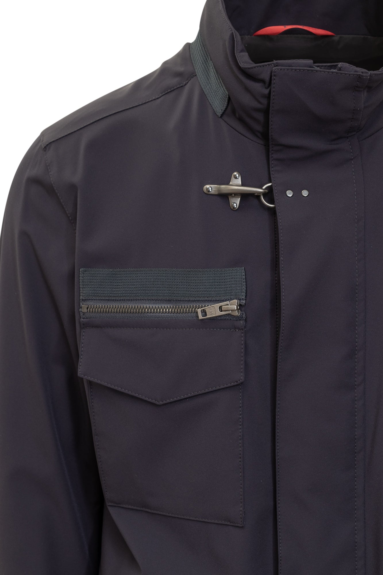 Long-sleeved jacket. High collar. Snap button and zipper closure. Cuffs with buttons. Two zippered chest pockets.Four flap pockets on front. Gancini buckle on front.