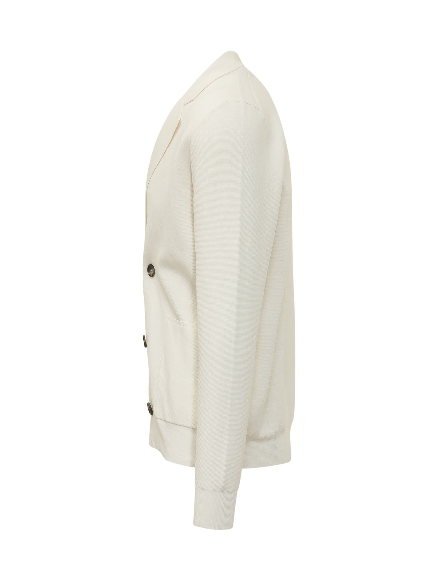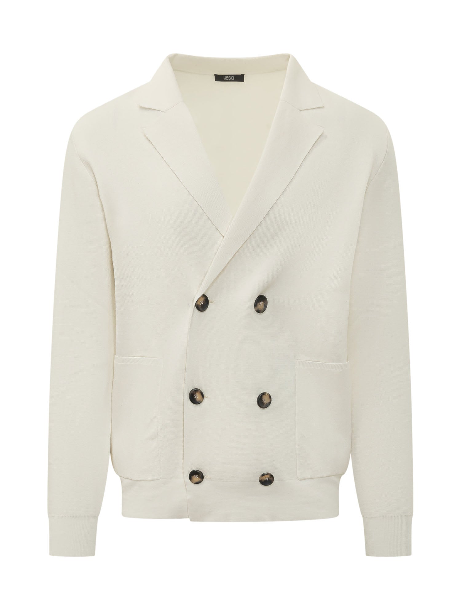 Blazer with classic lapel and double breasted button closure, front patch pockets and long sleeves with finished cuffs