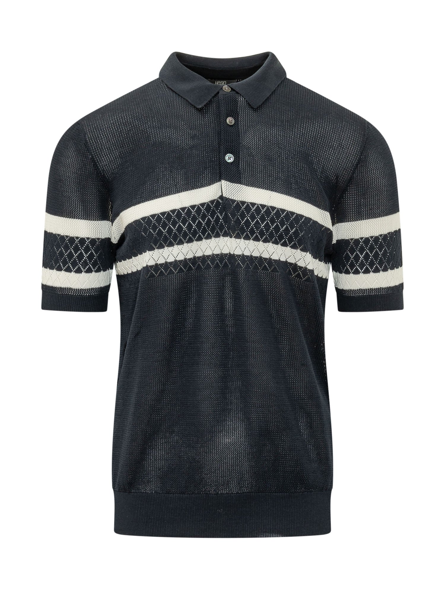 Polo with short sleeves and classic collar, mesh knit with striped pattern on front and sleeves, button closure and ribbed trims