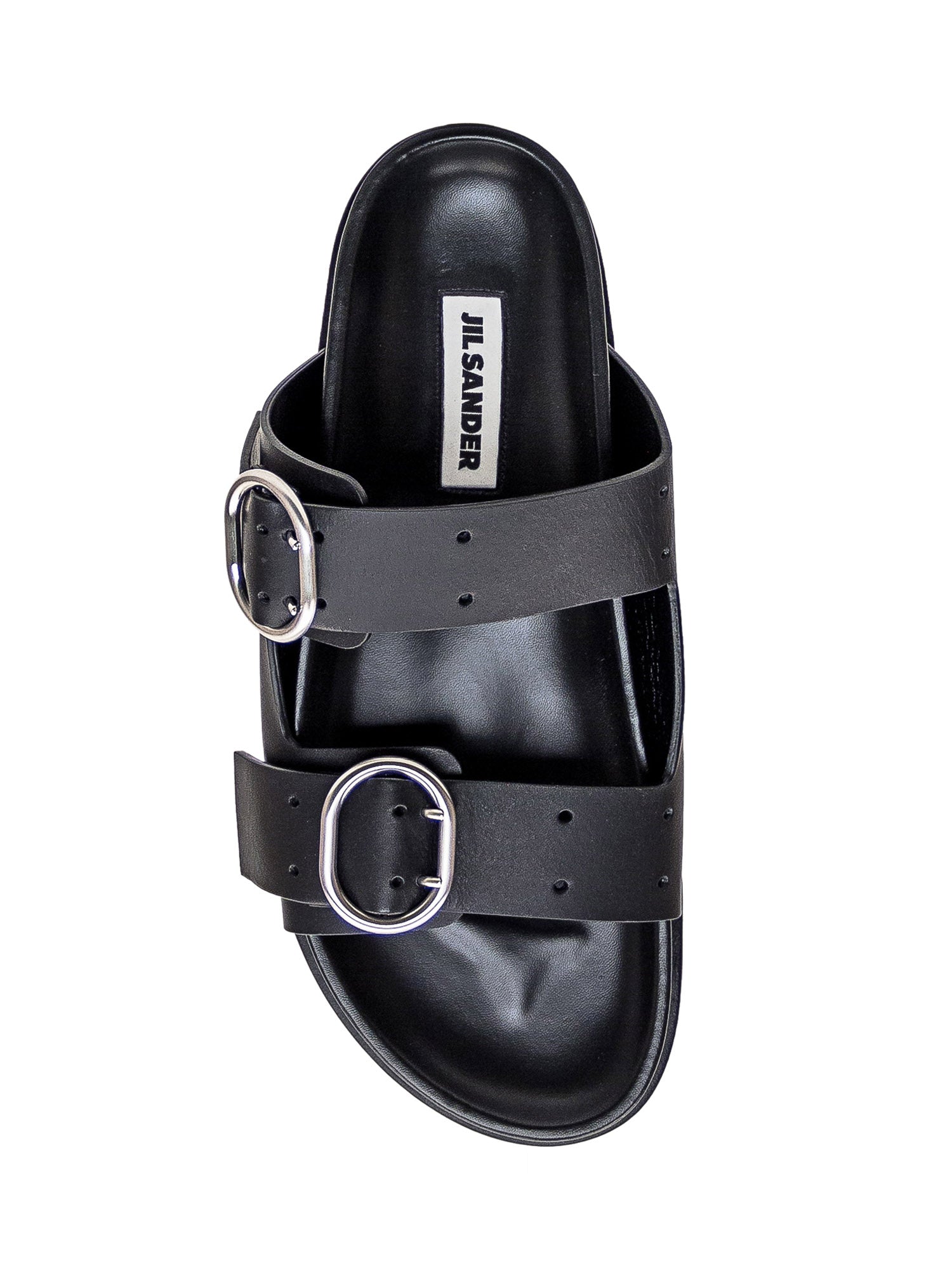 Black leather sandal. Closure with two adjustable straps with buckle. Logo patch on the inner sole.