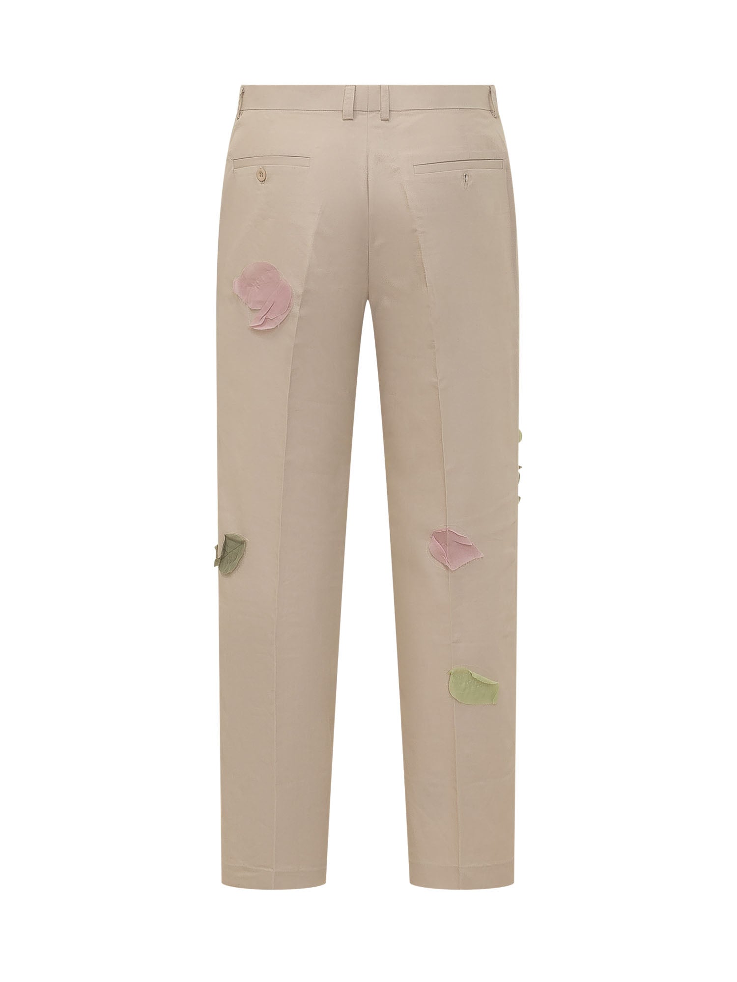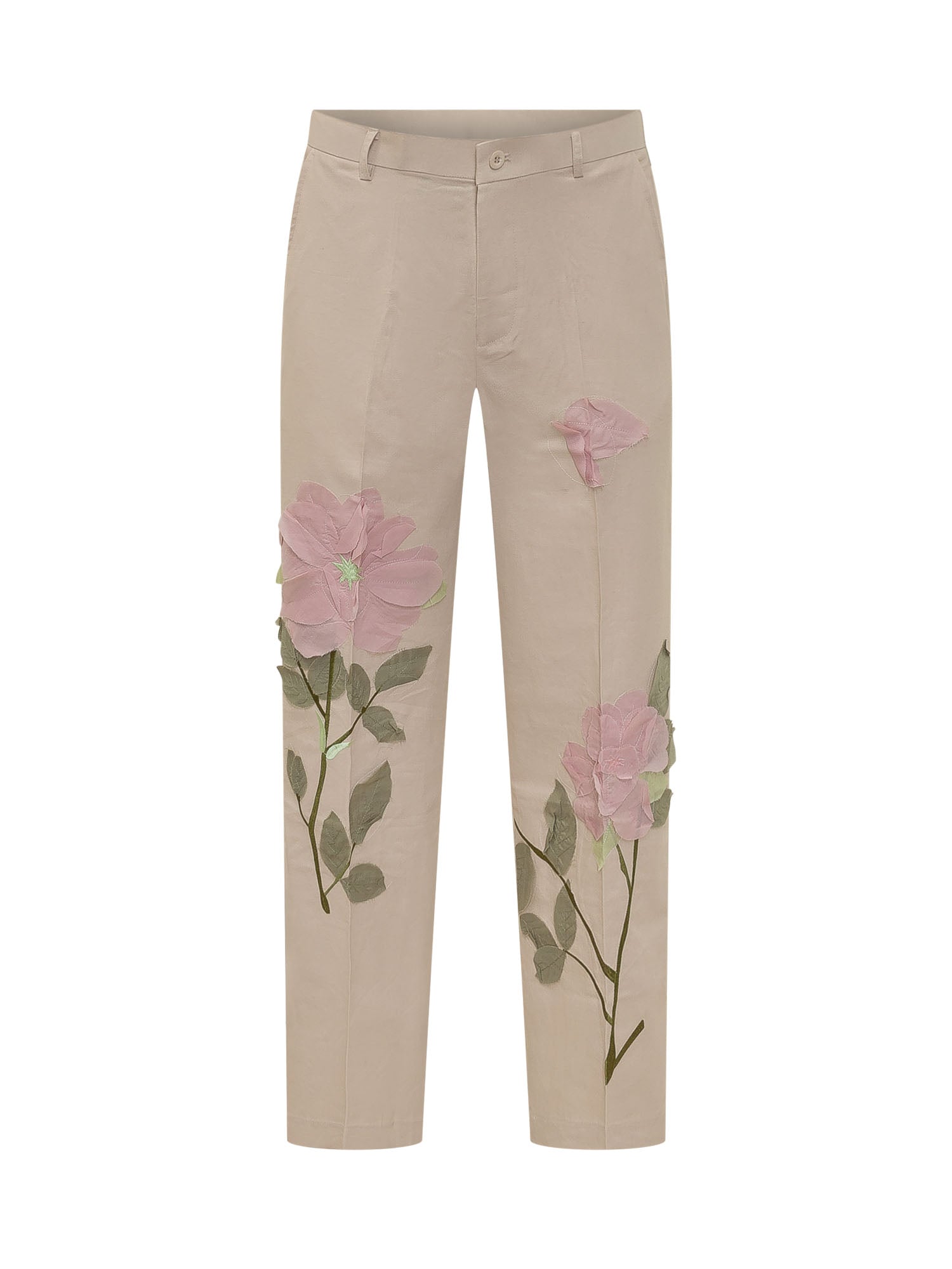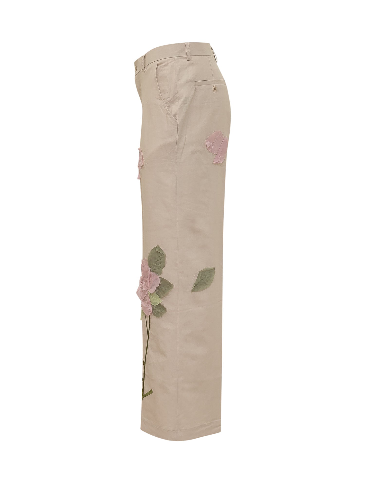 Trousers with front closure and belt loops, featuring floral appliques along the legs