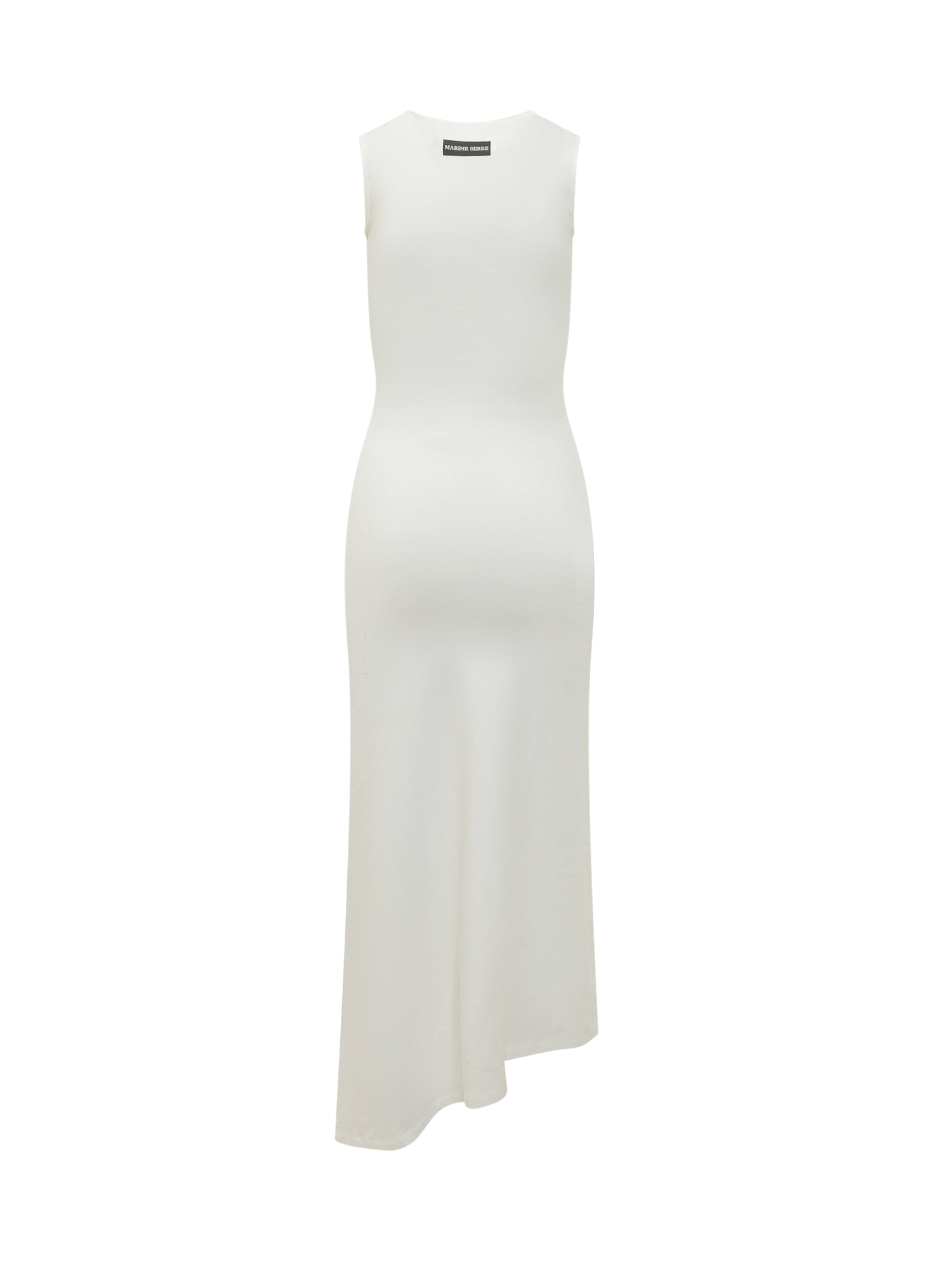 Midi dress with round neckline and fitted structure. Front embroidered logo and asymmetric hem. Clean silhouette with contemporary design.