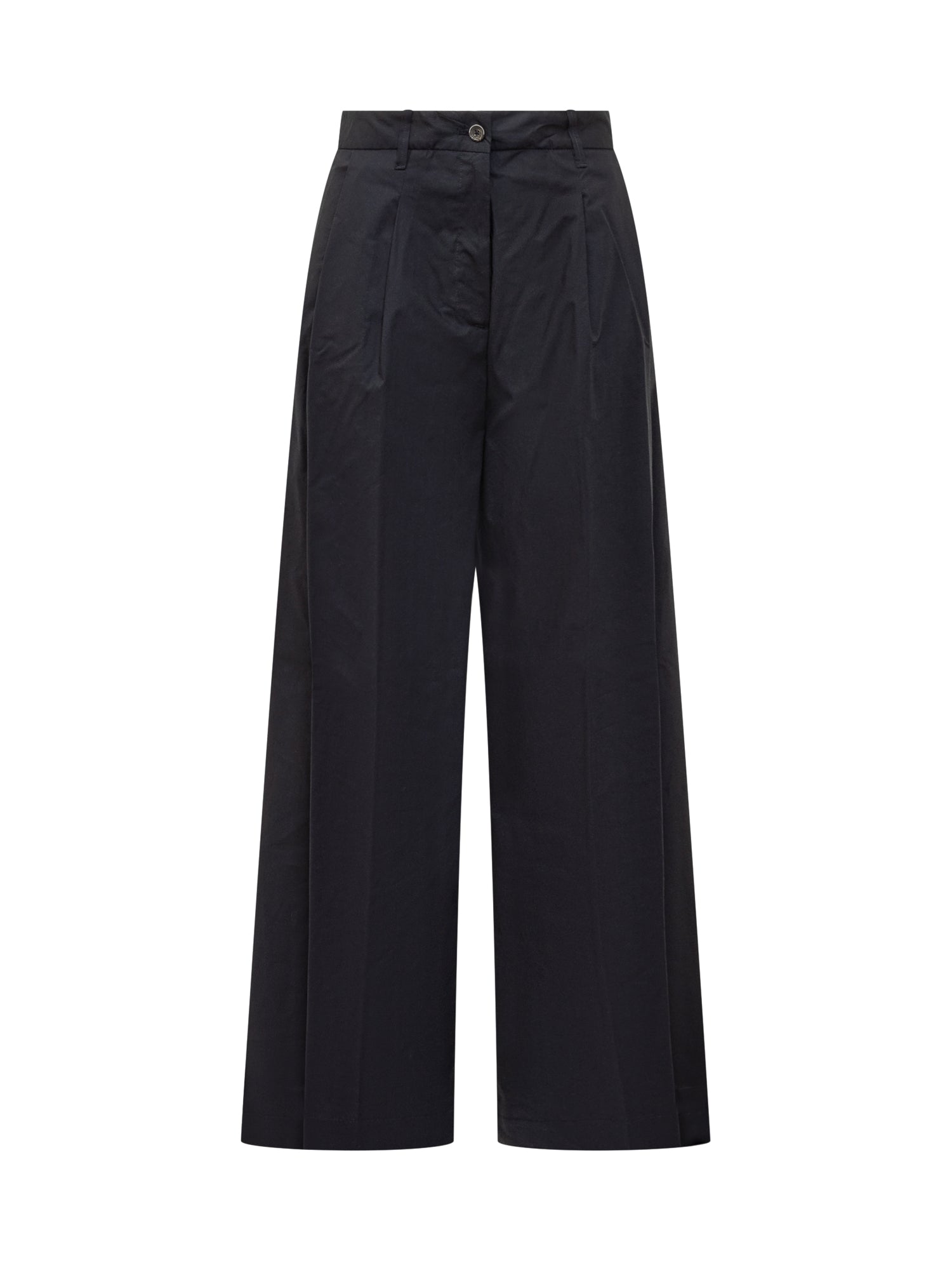 Wide cut with front pleats. Button and zip fastening. Belt loops. Two side welt pockets and two back flap pockets. Applied logo label on the back.
