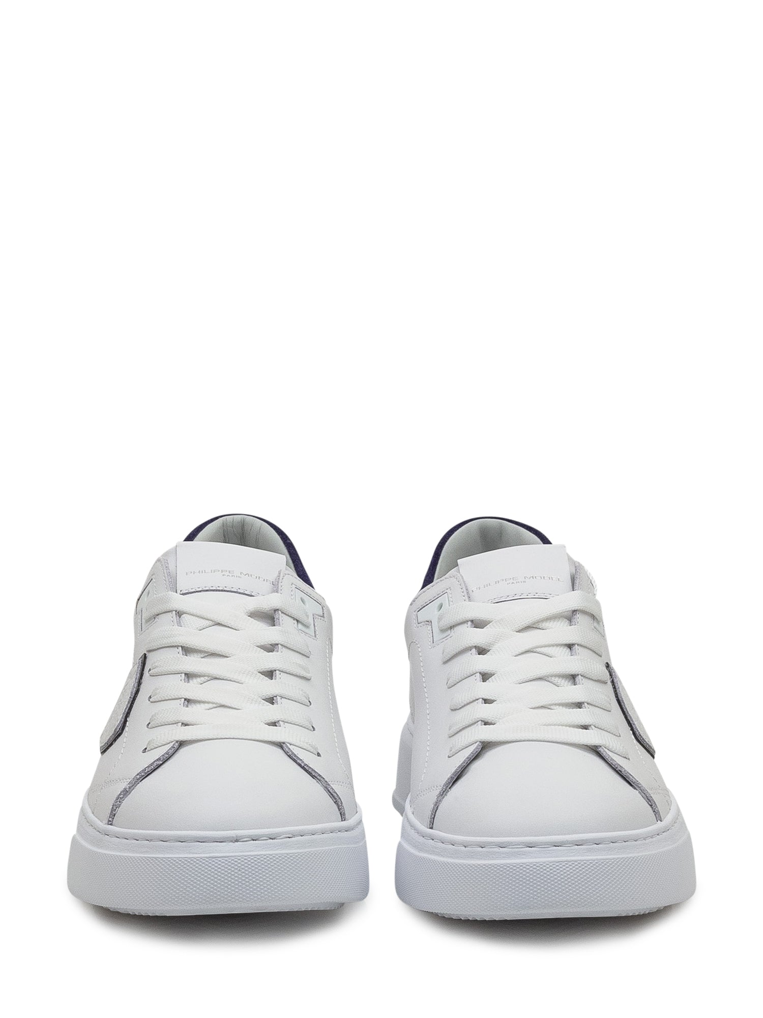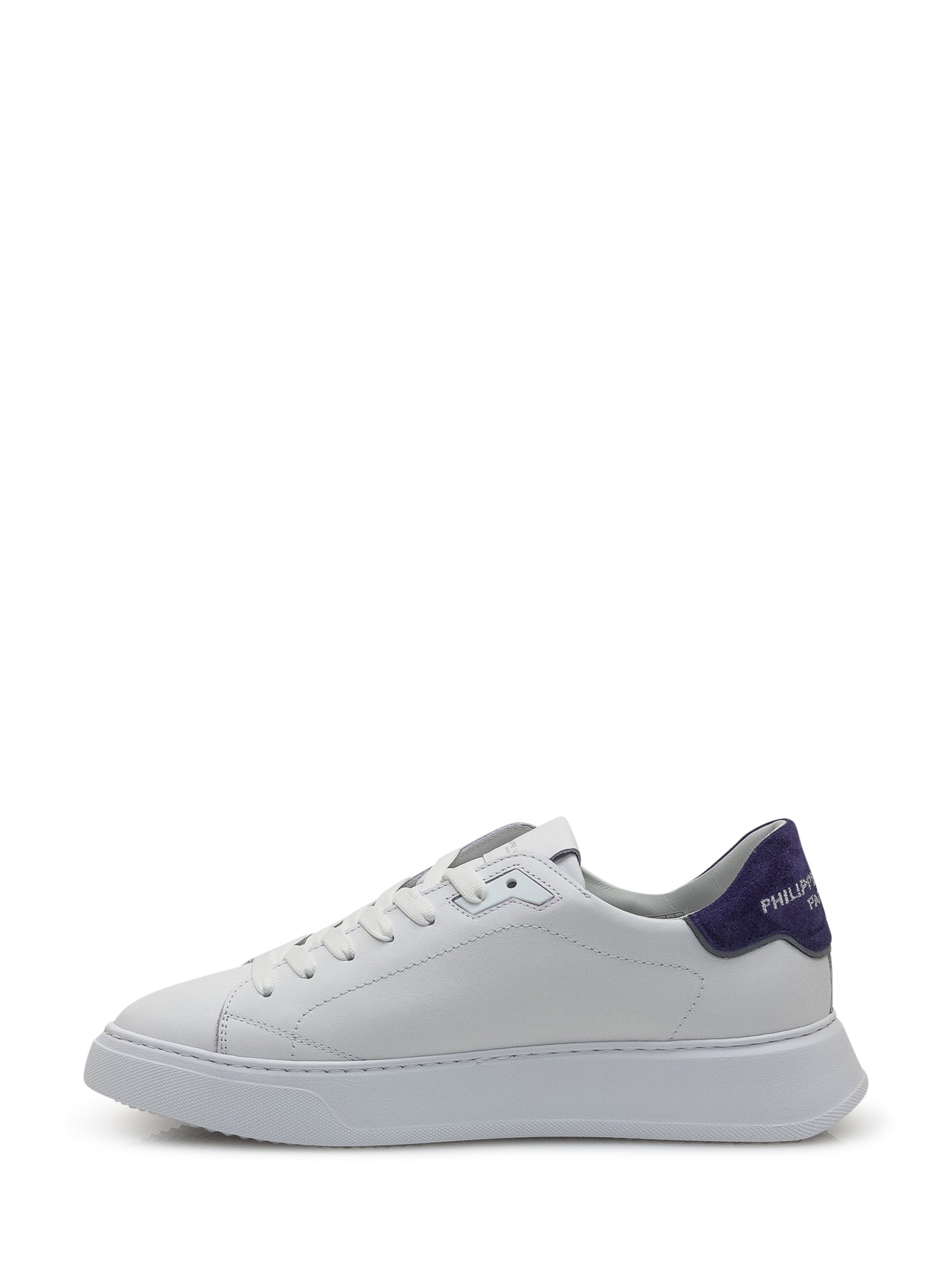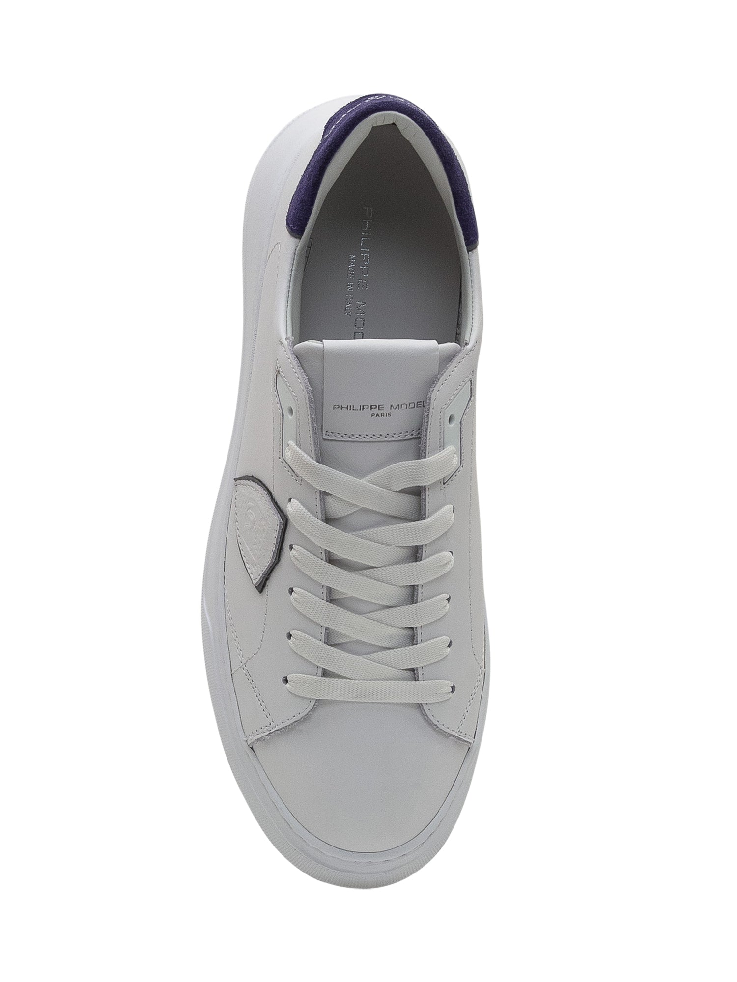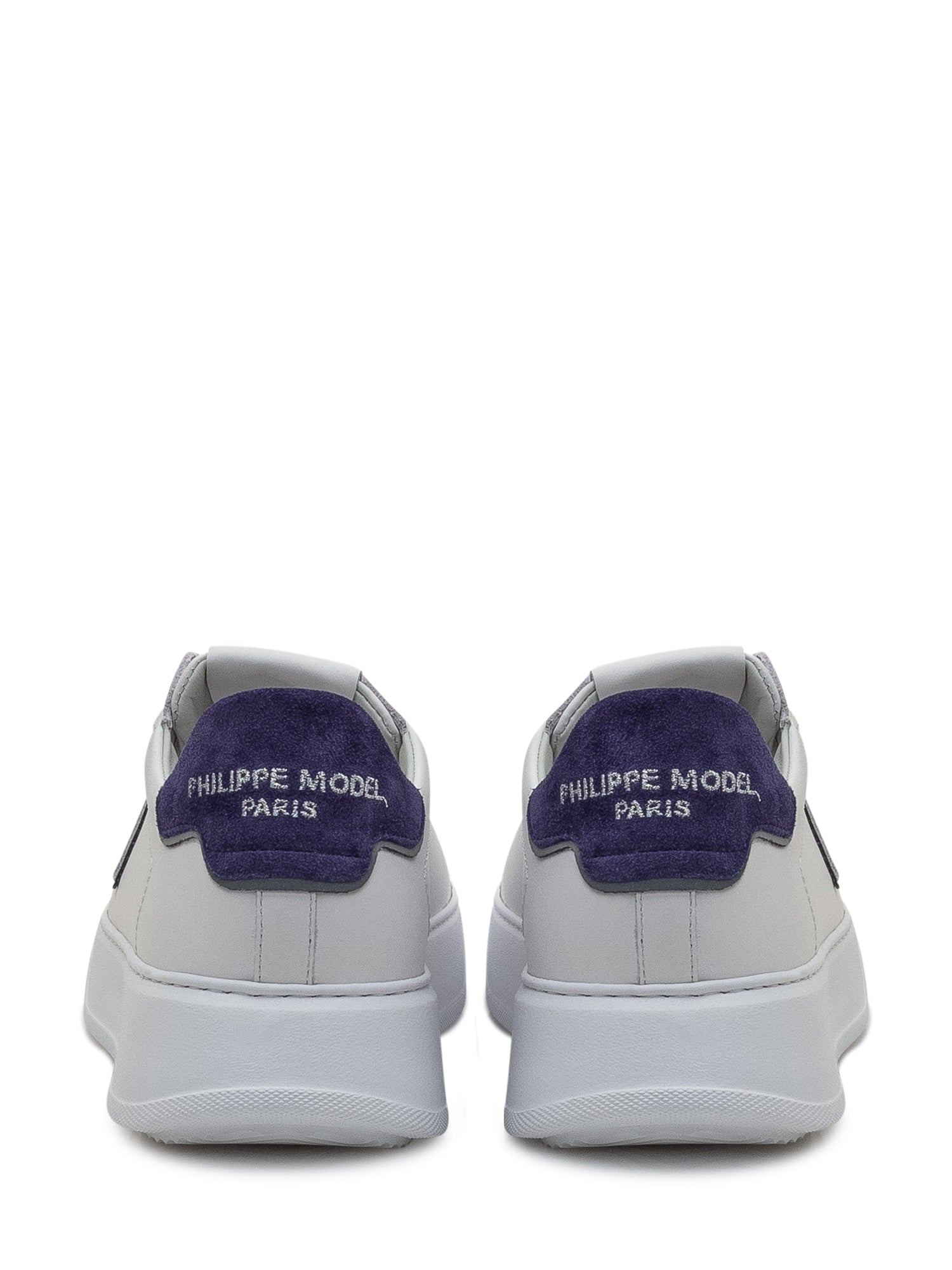Philippe Model sneakers in white leather with violet suede detail on the heel. Shield logo stitched on the side and tone-on-tone chunky sole.
