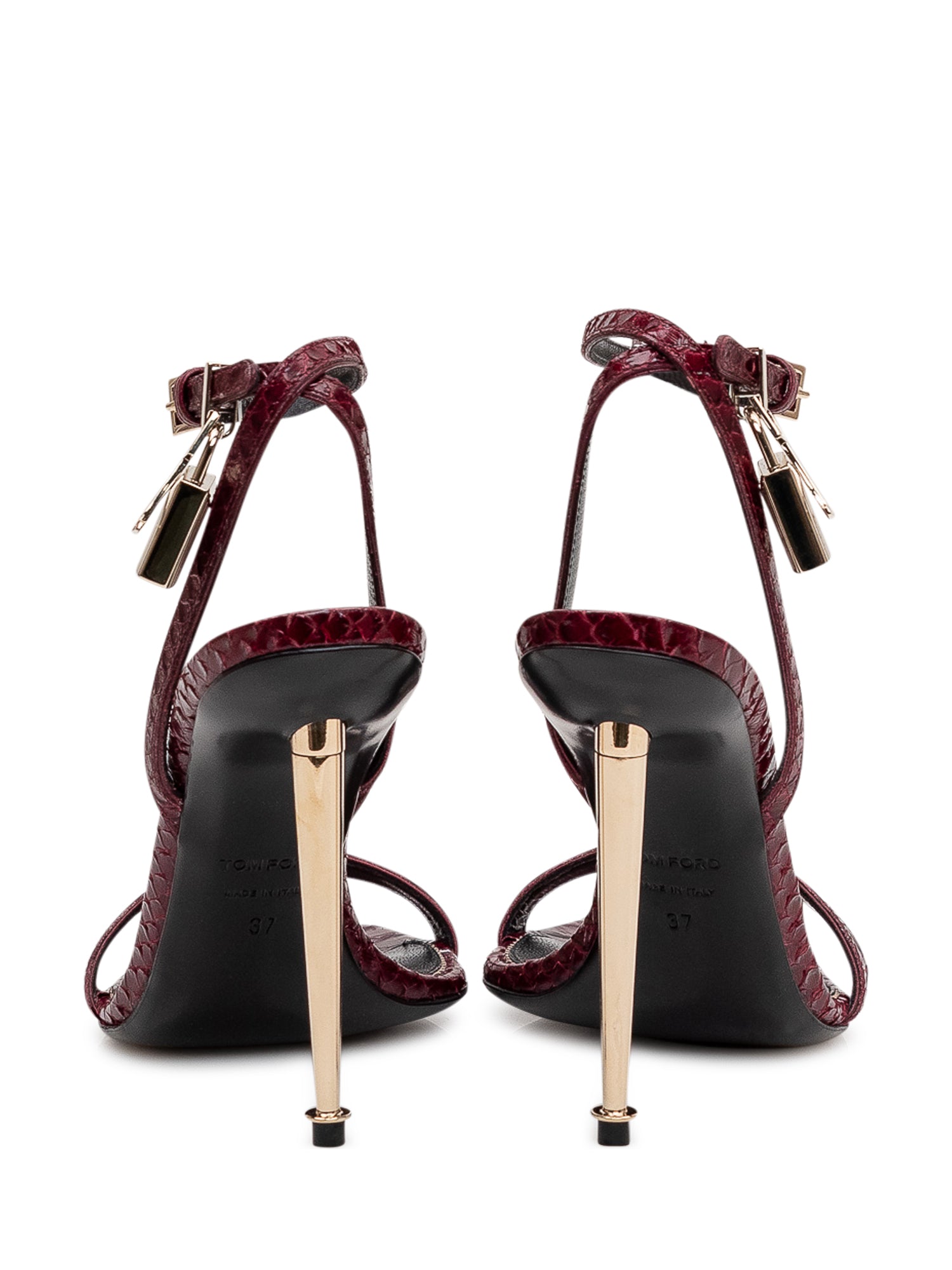 Elegant sandal featuring ankle strap and semi-shiny textured finish. Slim metallic heel and charm detail.Heel Height: 4.72