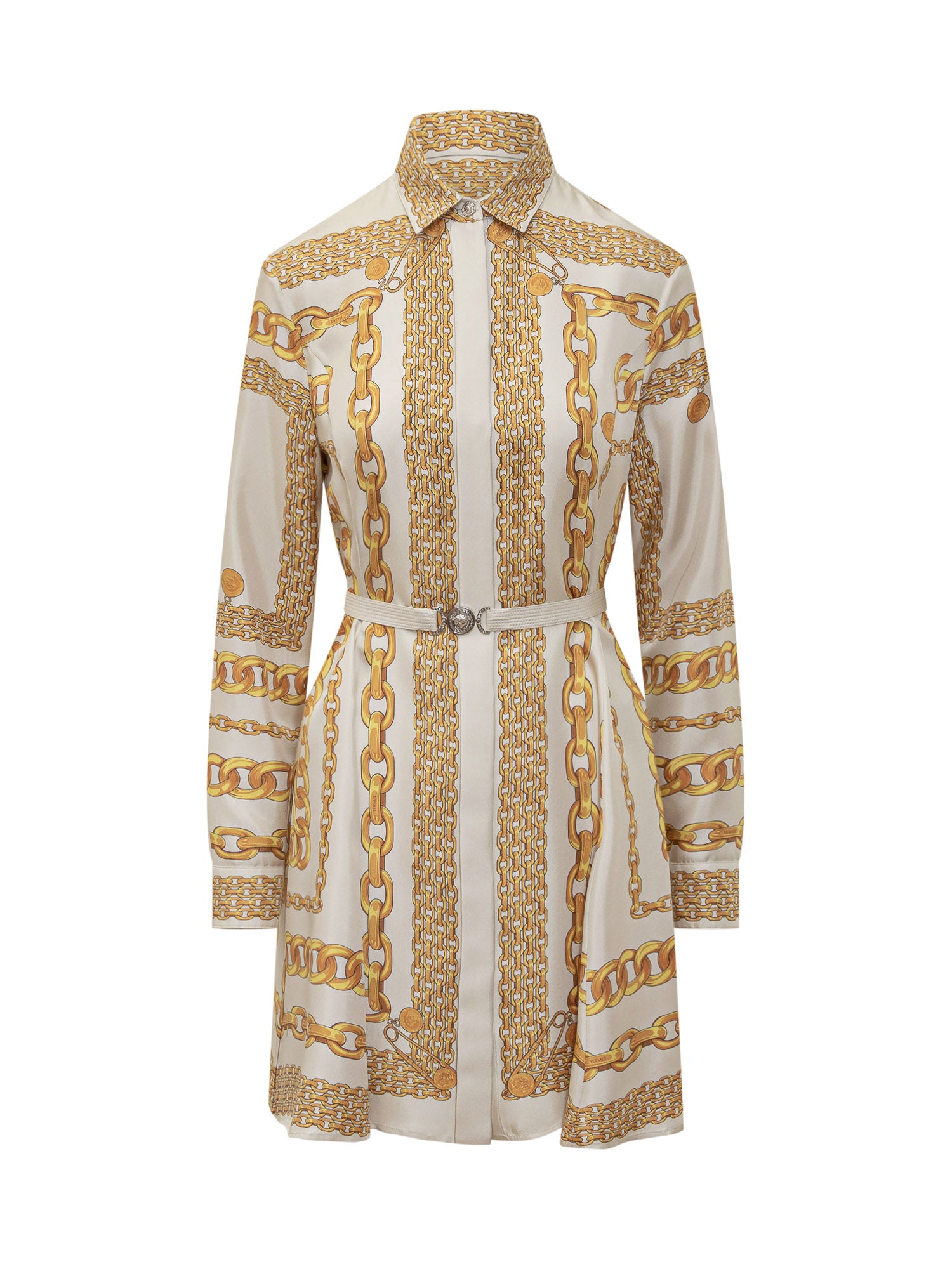 Multicoloured patterned silk dress. Concealed button fastening. Waist belt. Long sleeves with buttons at cuffs.