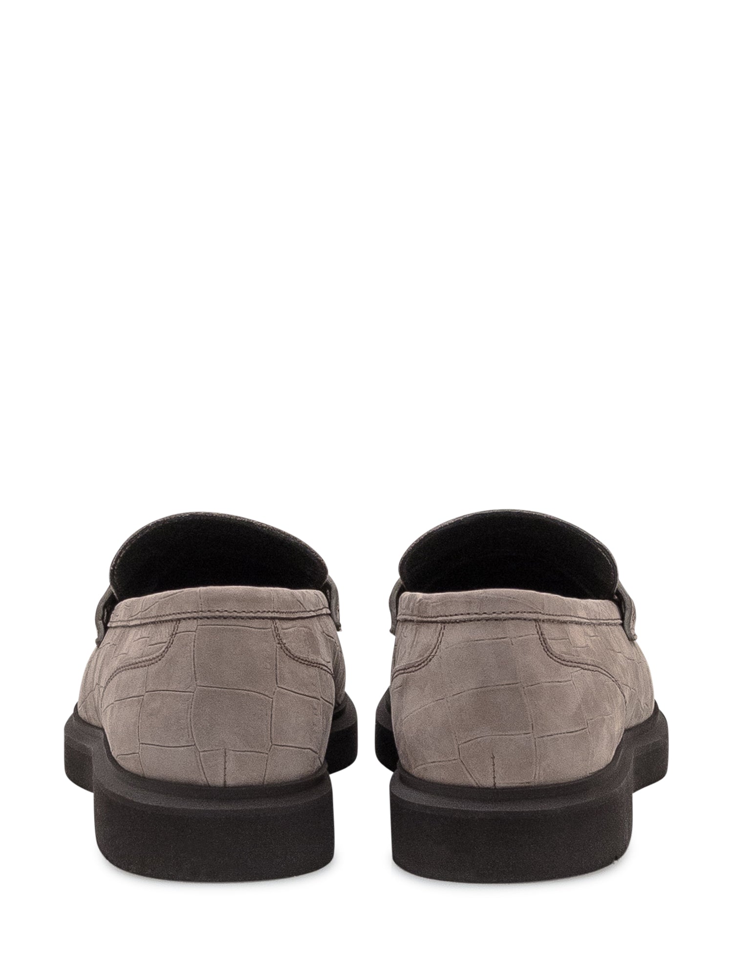 Men s loafer in taupe crocodile-effect leather with a black rubber sole.