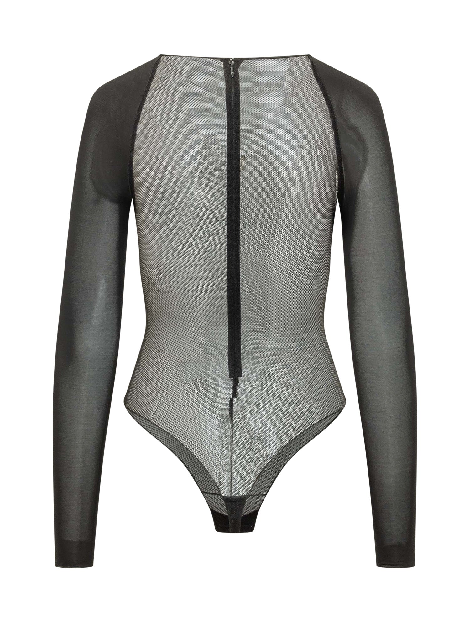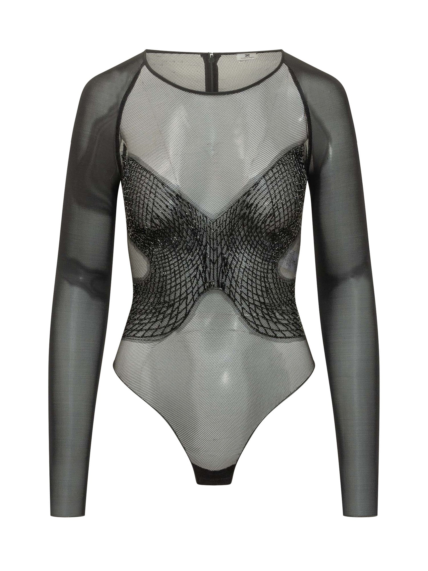 Long-sleeve sheer tulle bodysuit with graphic embroidery and corset-inspired detailing. Flattering fitted silhouette with back fastening and high-cut leg.