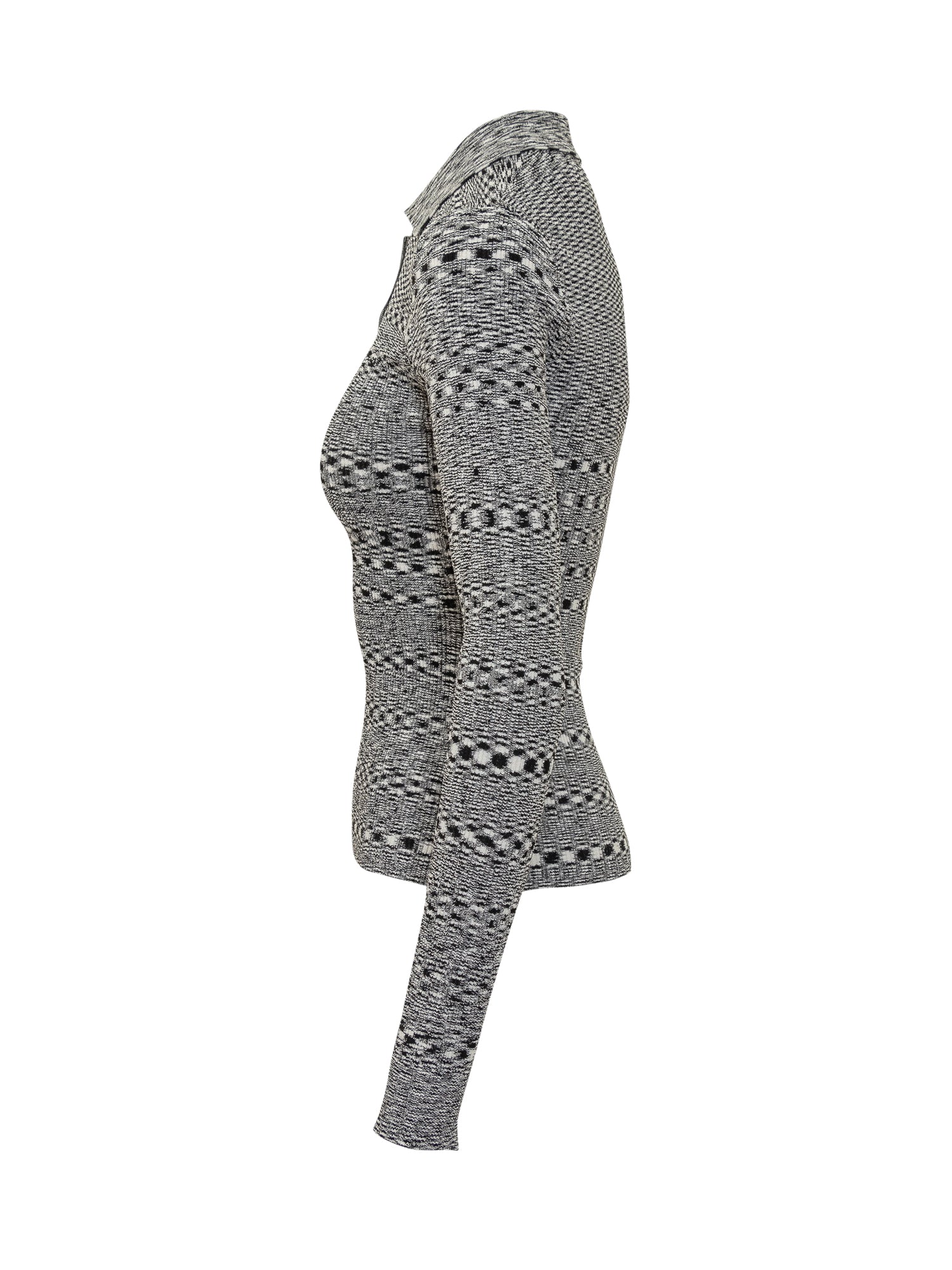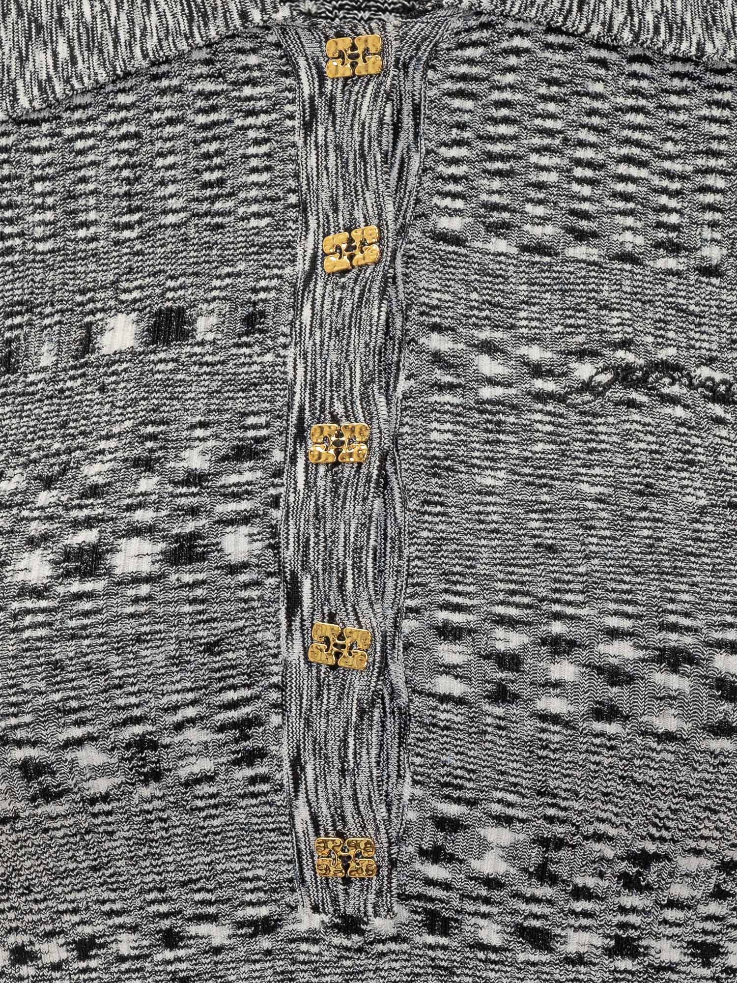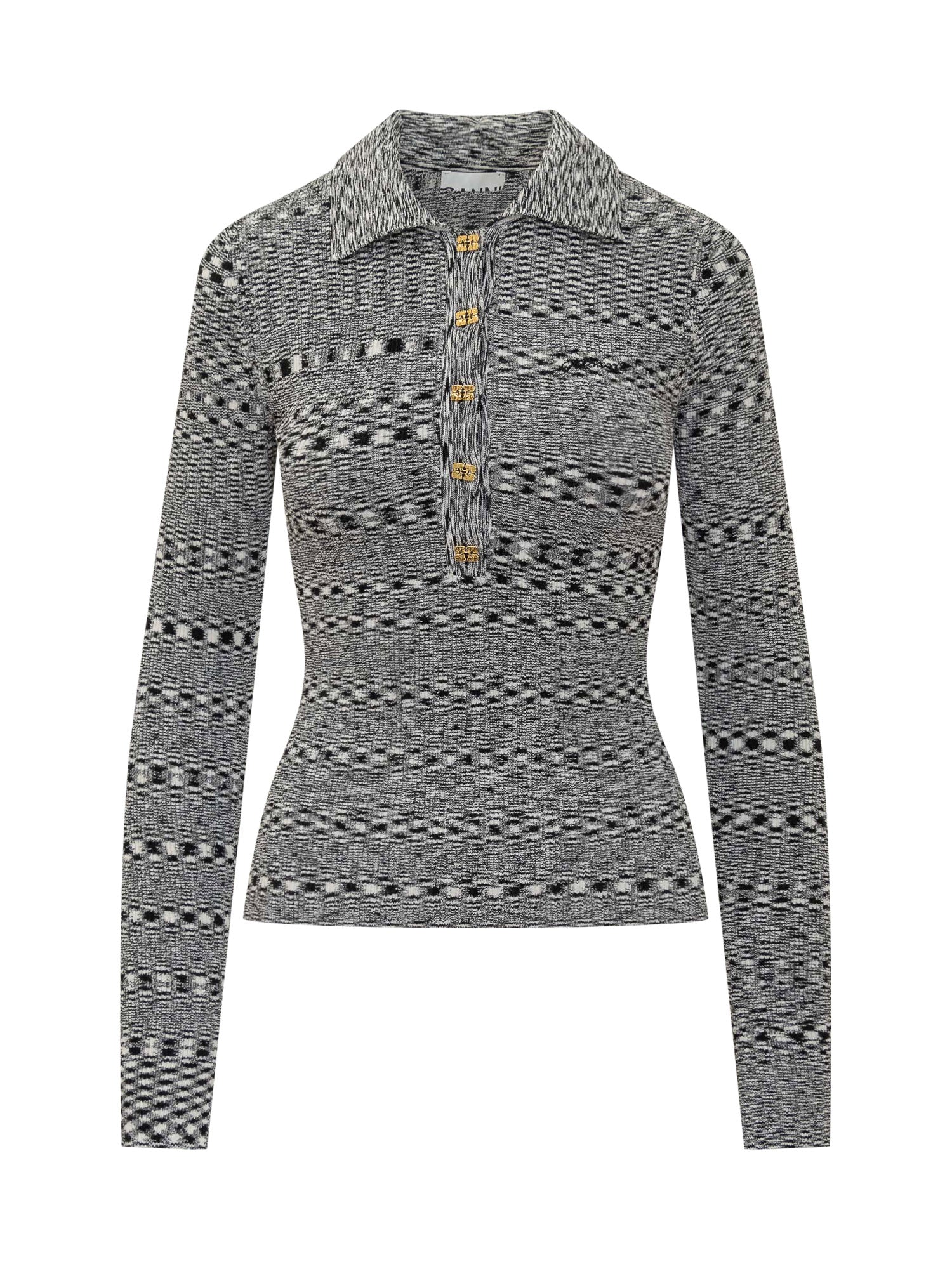 Ganni jacquard knit top in grey and black with polo collar and gold-tone buttons.