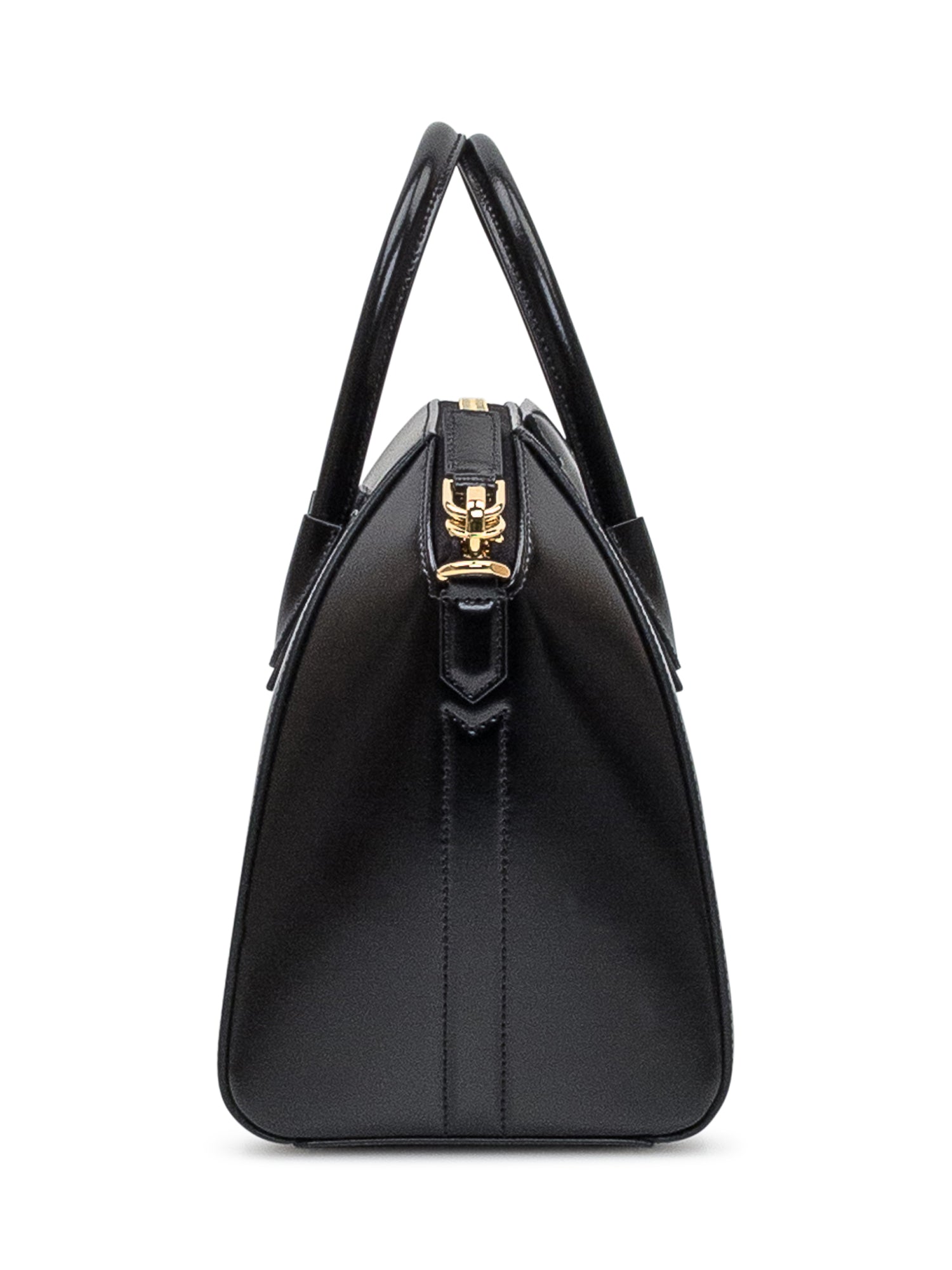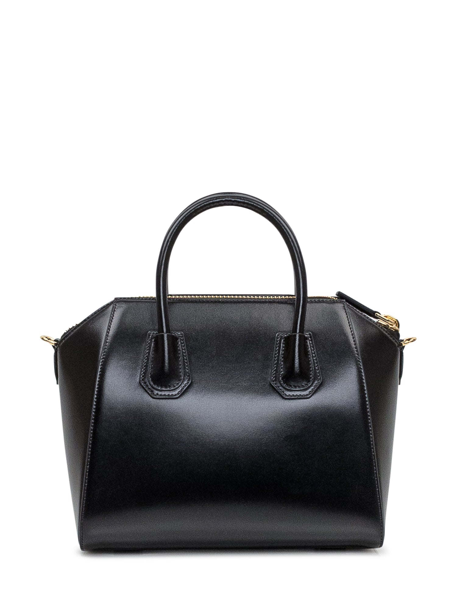 Givenchy Antigona Small bag in glossy black leather with double handles and front logo. Elegant and versatile, it features a removable shoulder strap for crossbody or shoulder wear.