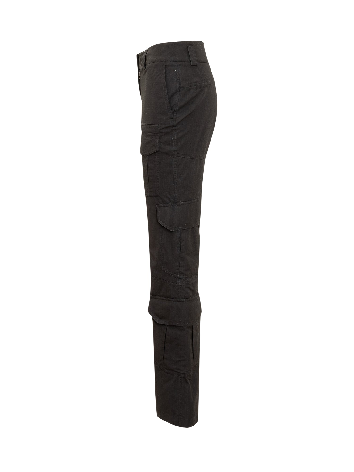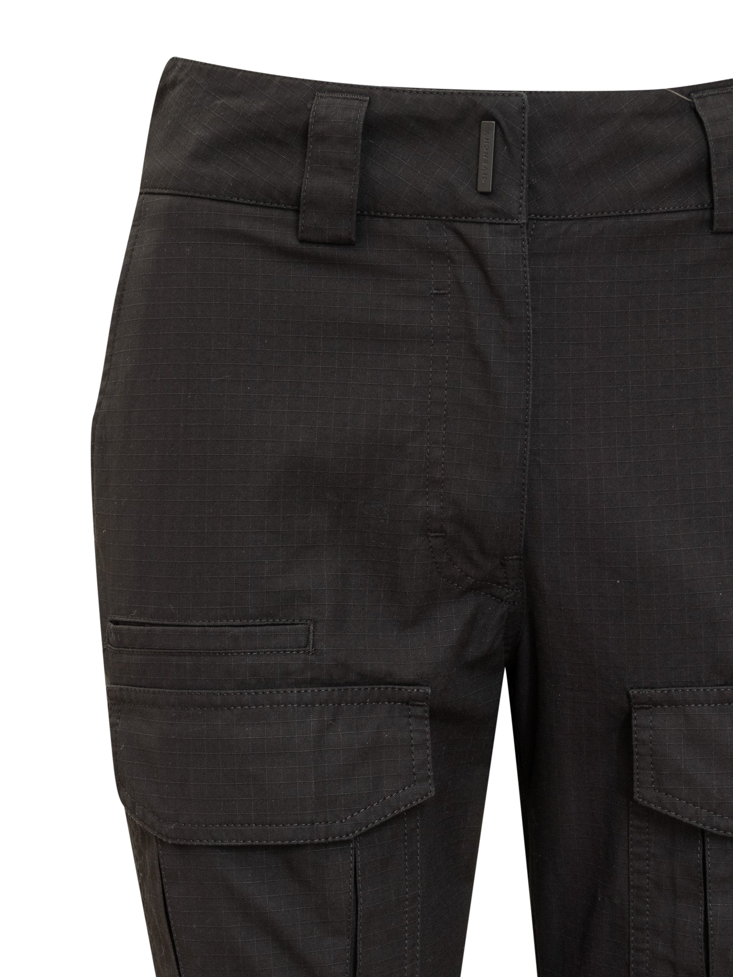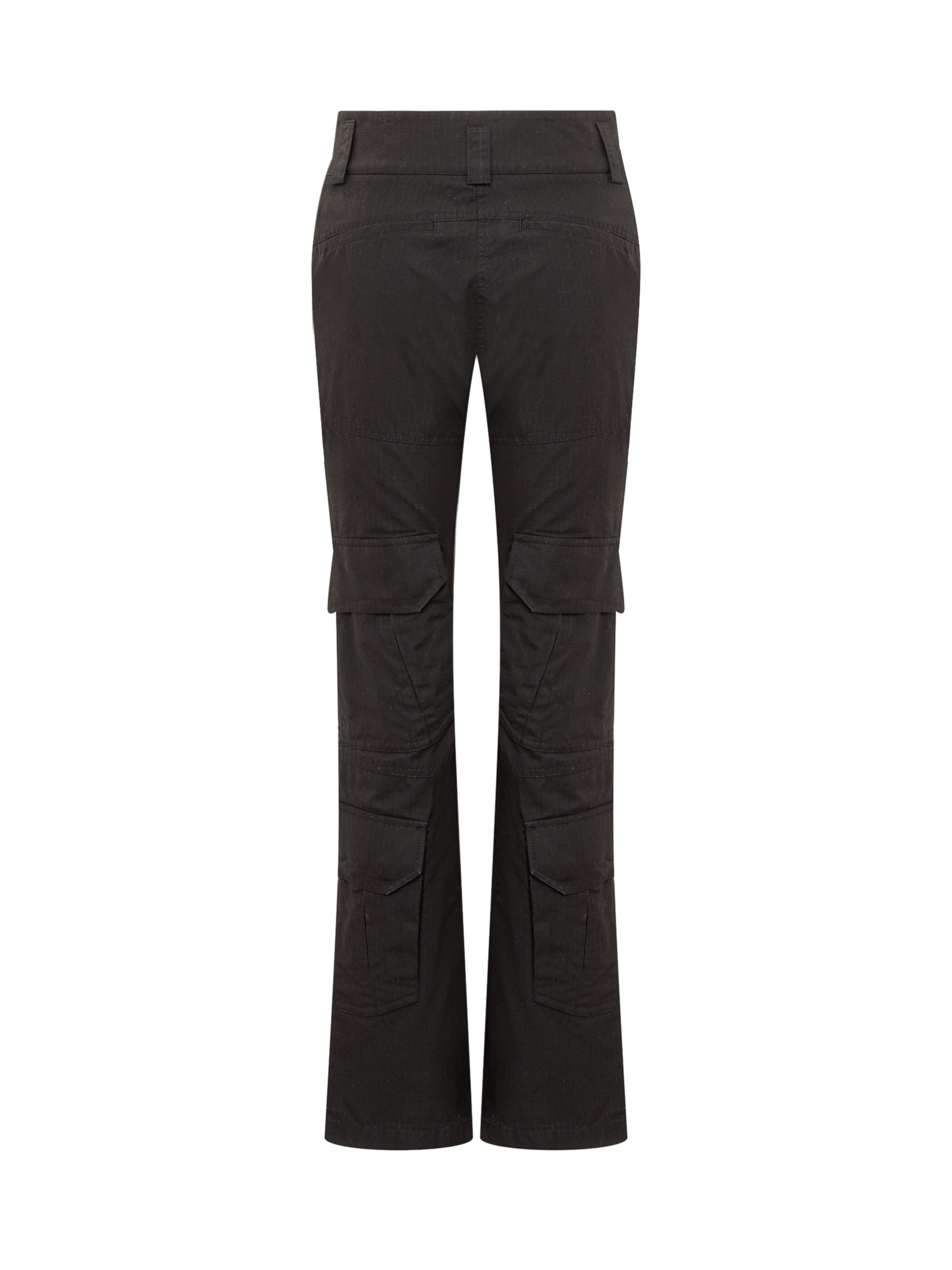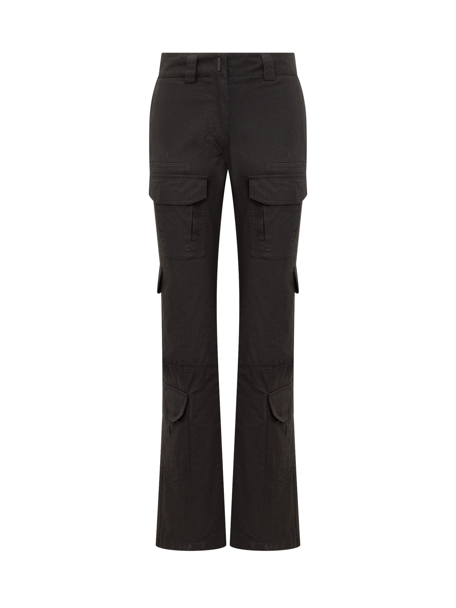 Flared long trousers. Cargo fit. Zip and hook fastening. Belt loops. All-over pockets. All-over embossed geometric motif. Logo plaque on front.