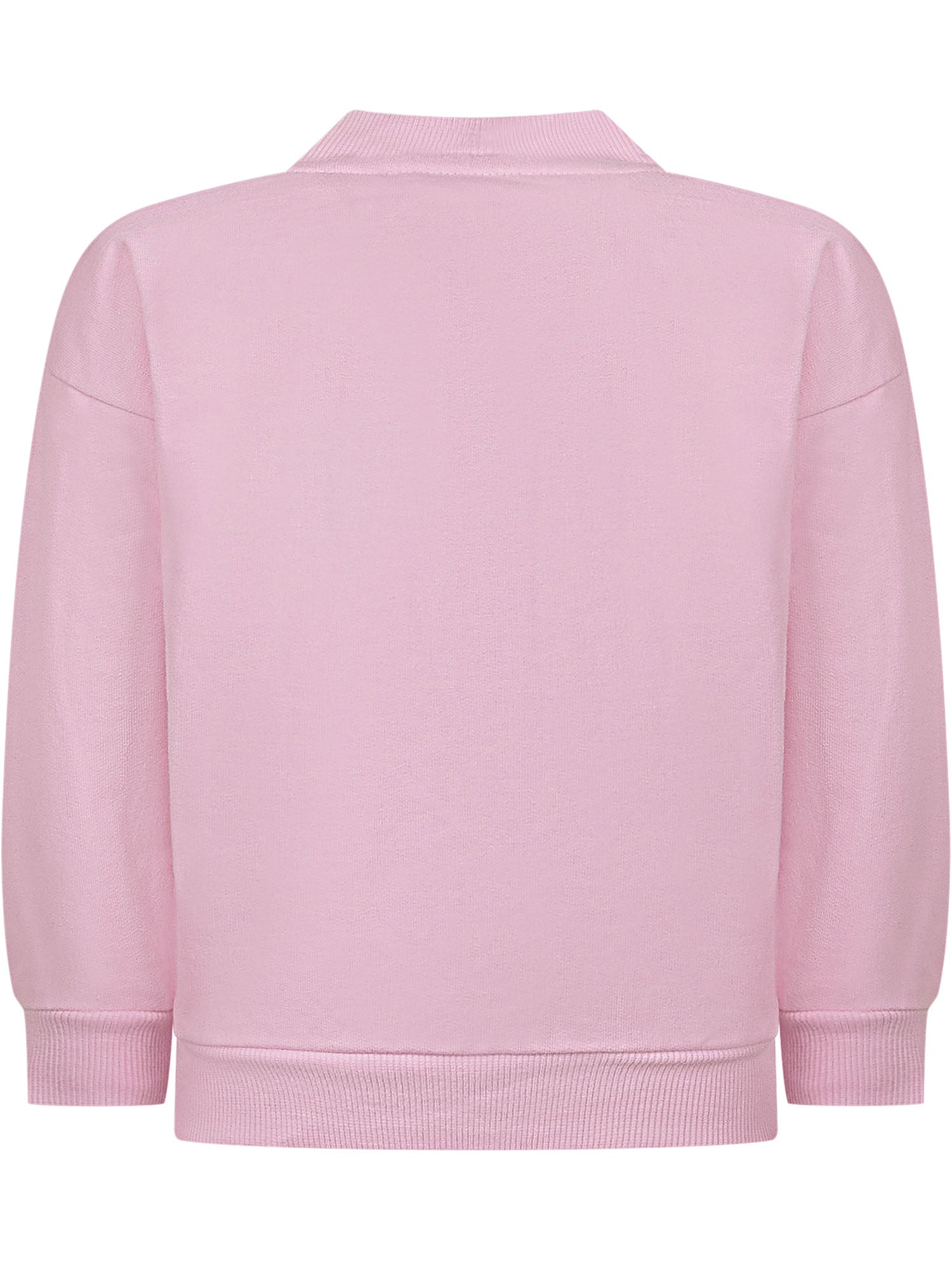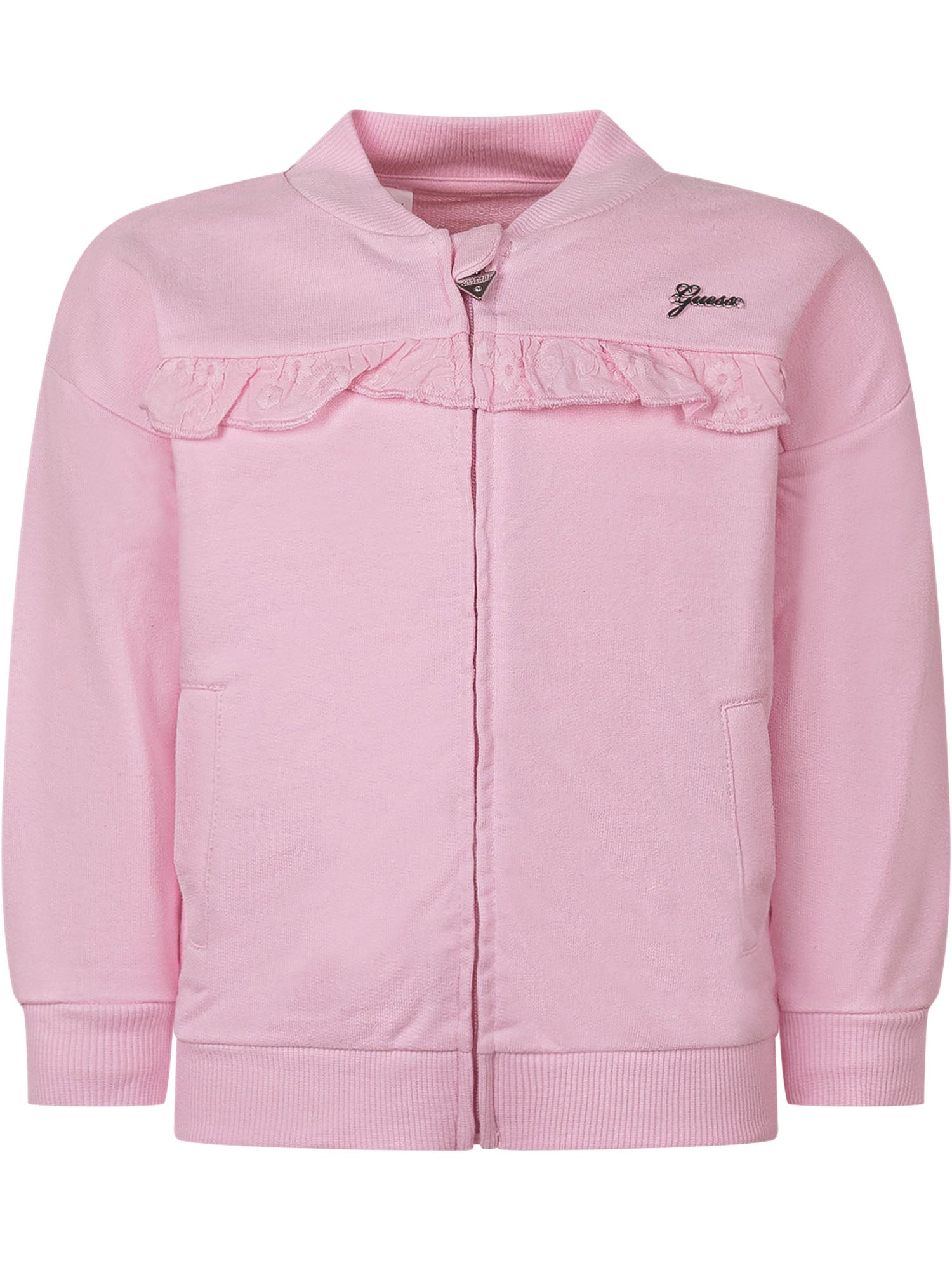 Long sleeve sweatshirt with front zip closure, ruffle detail on the chest and side pockets, soft and feminine design