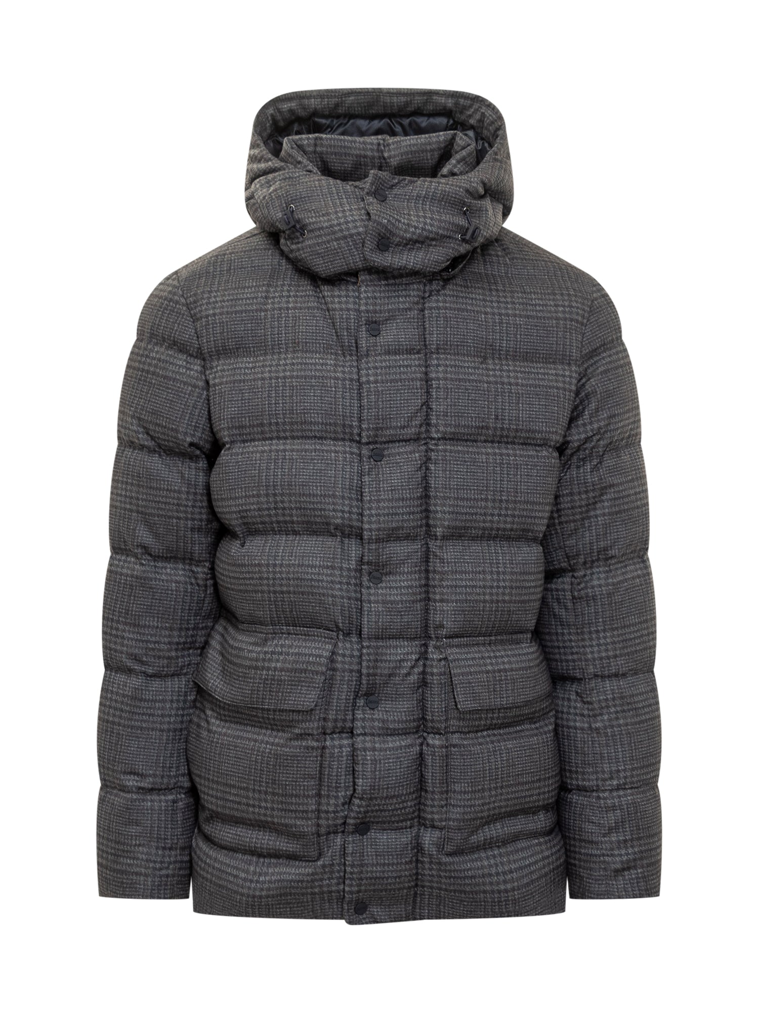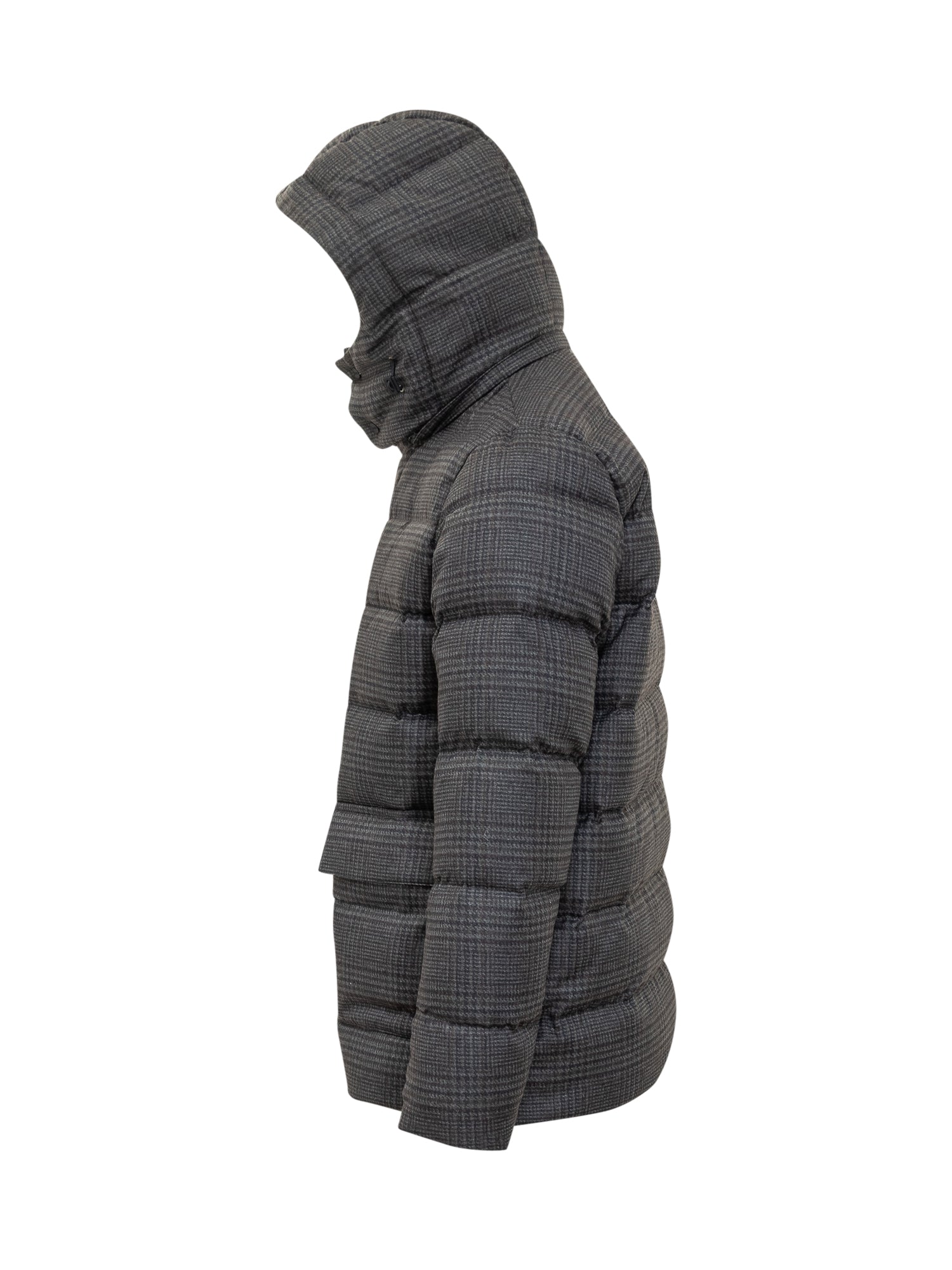 Herno puffer jacket in grey fabric with check pattern, warm padding, adjustable hood and front pockets.