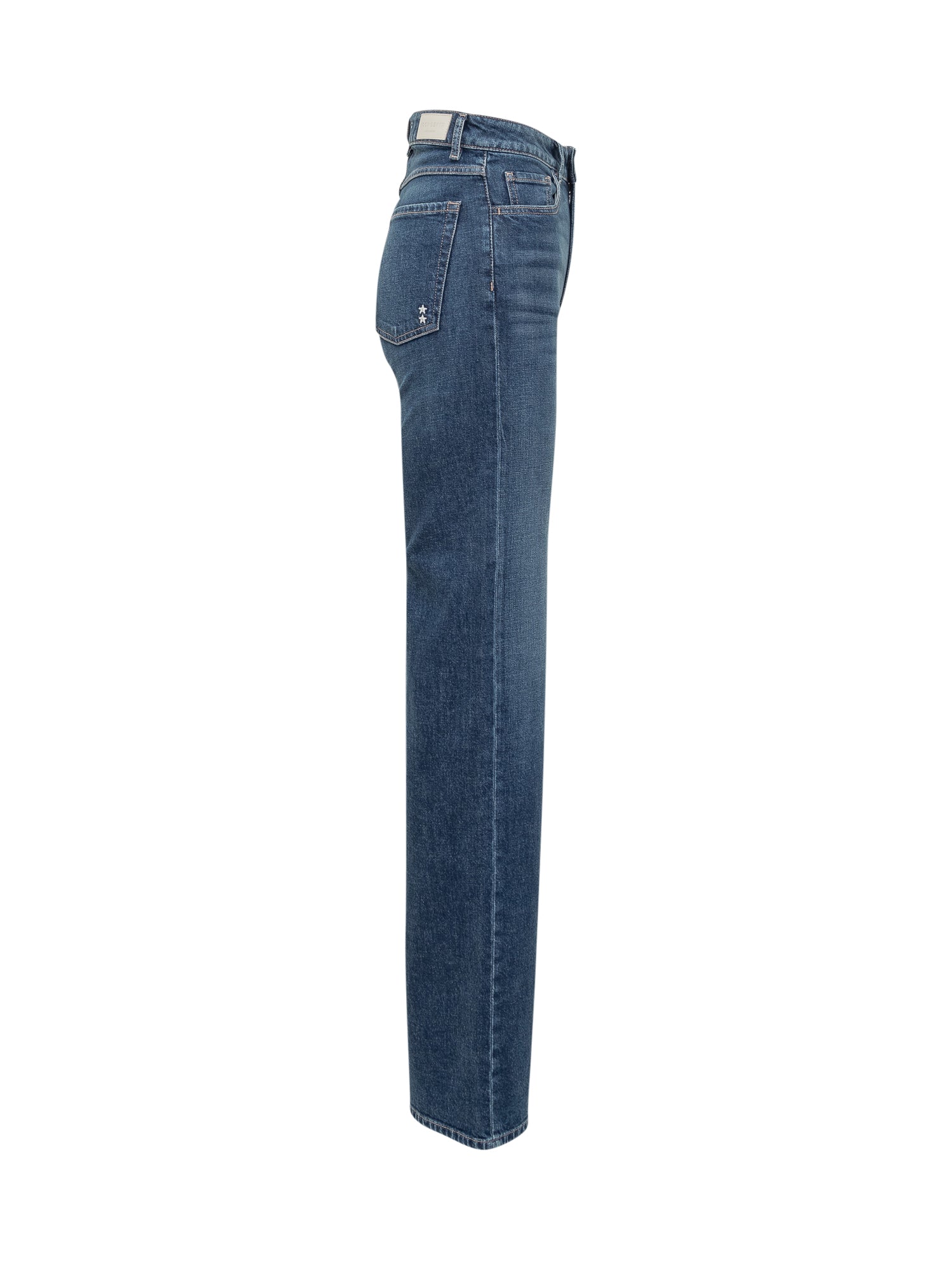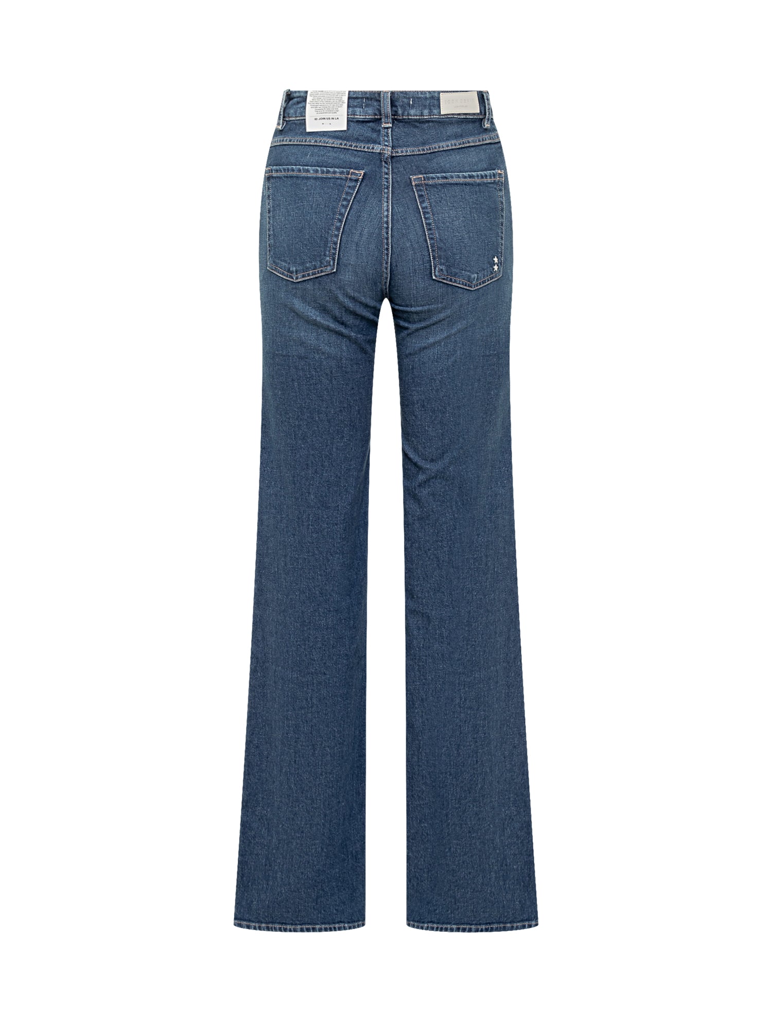 Icon Denim Joia jeans in blue denim with faded wash and flared silhouette. High waist with button and zip closure.