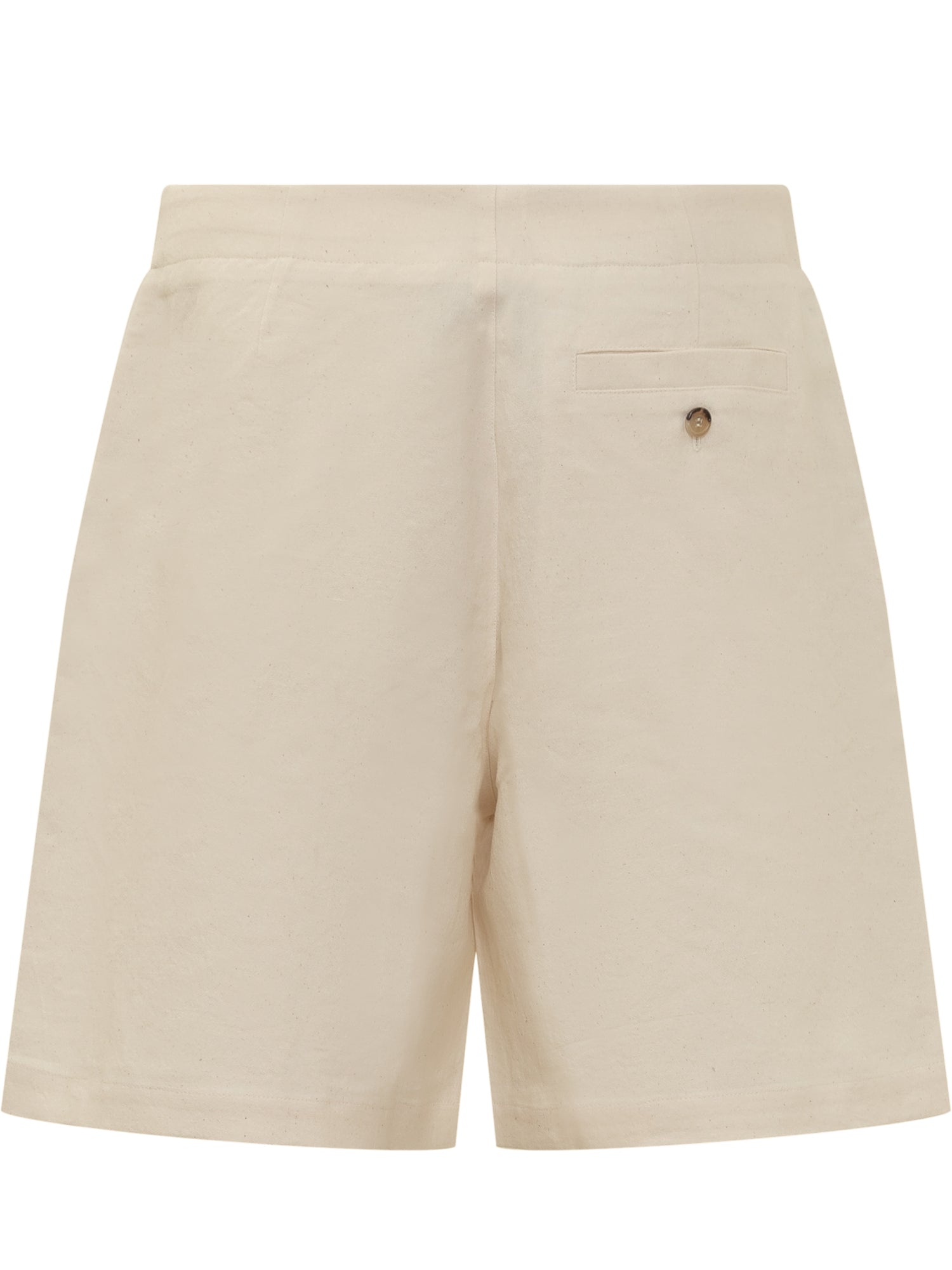 Short pants. Button and zipper closure. Drawstring waistband. Flush pockets on sides. Stitched flap pocket with button on back. Contrasting logo band.