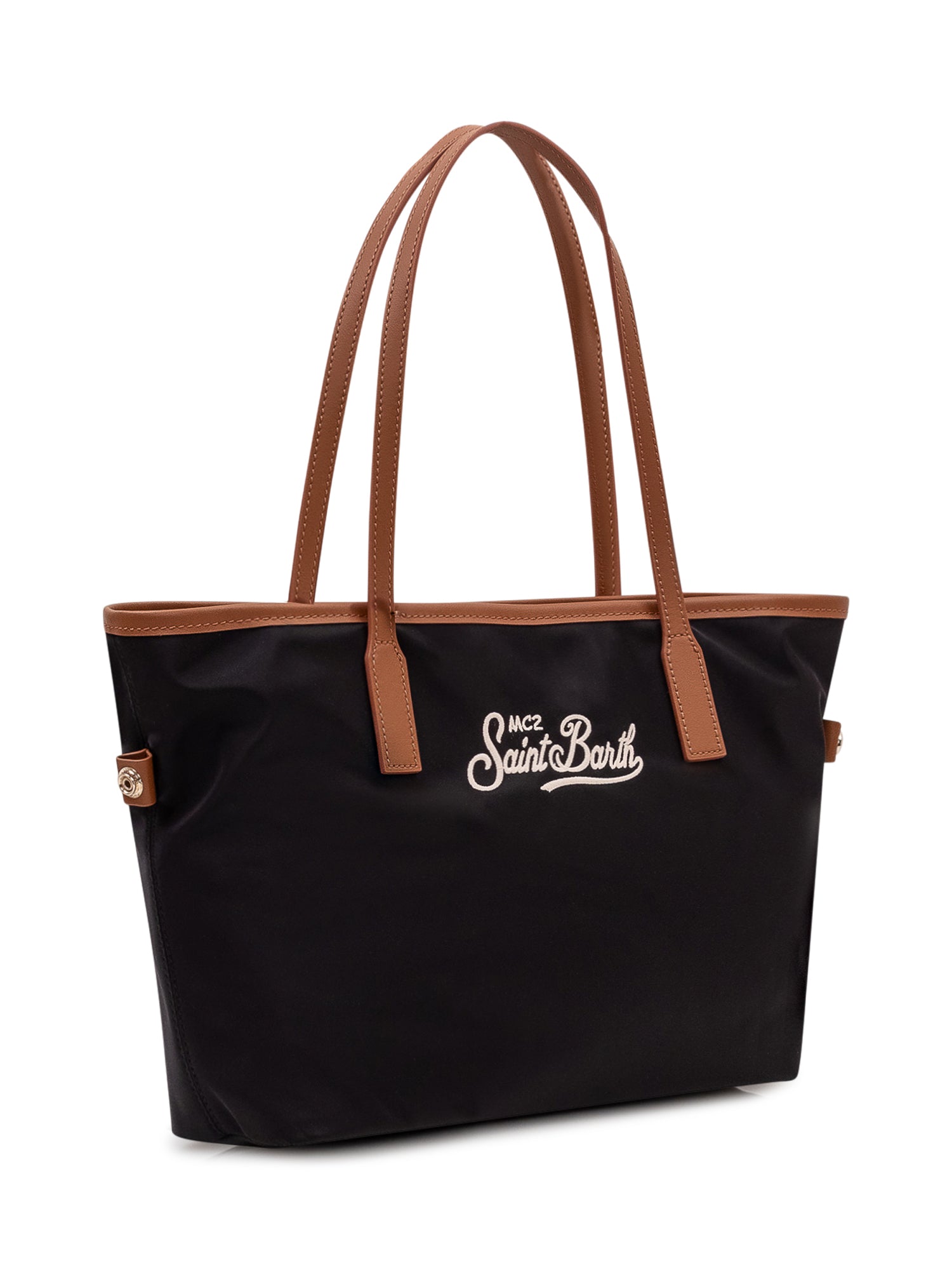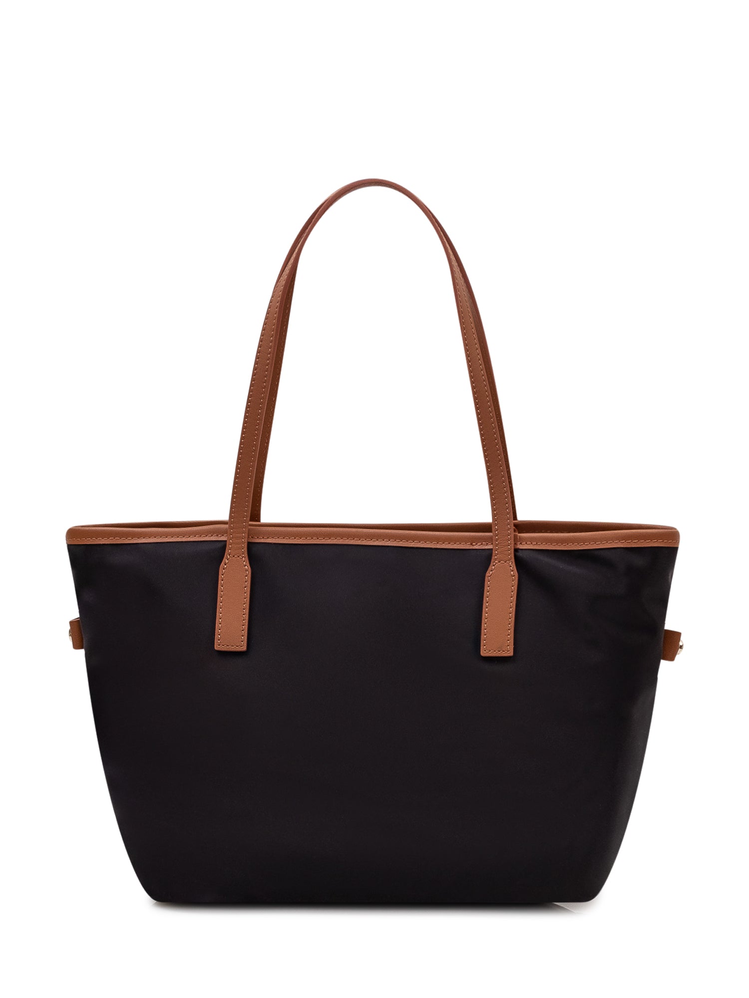 Nylon tote bag with double handles and printed front logo. Soft spacious structure with expandable sides.