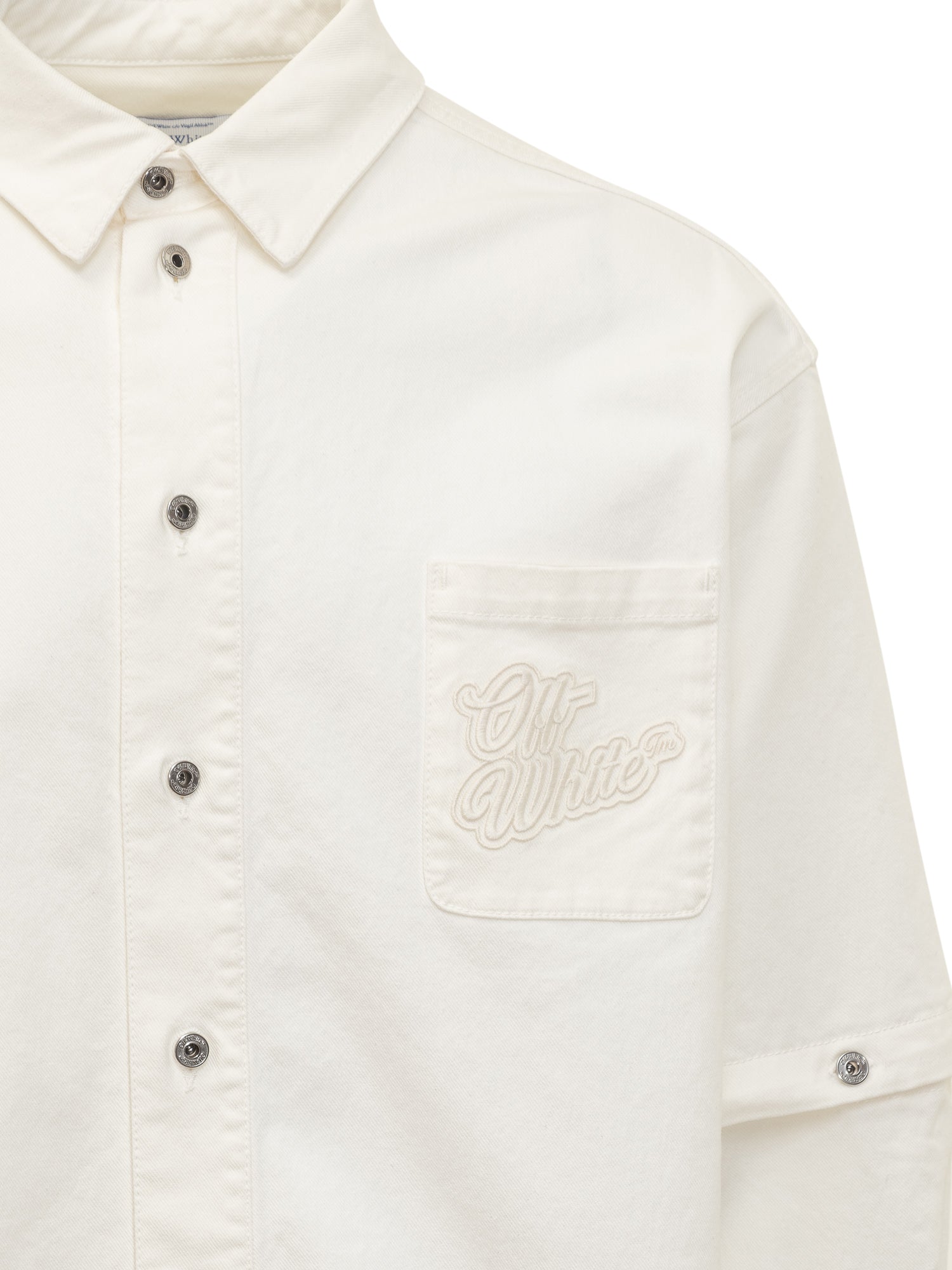 Long-sleeved cotton shirt. Classic collar. Button closure. Button cuffs. Front pocket with Off-White logo patch. Logo patch tag on back. Double sleeve effect.