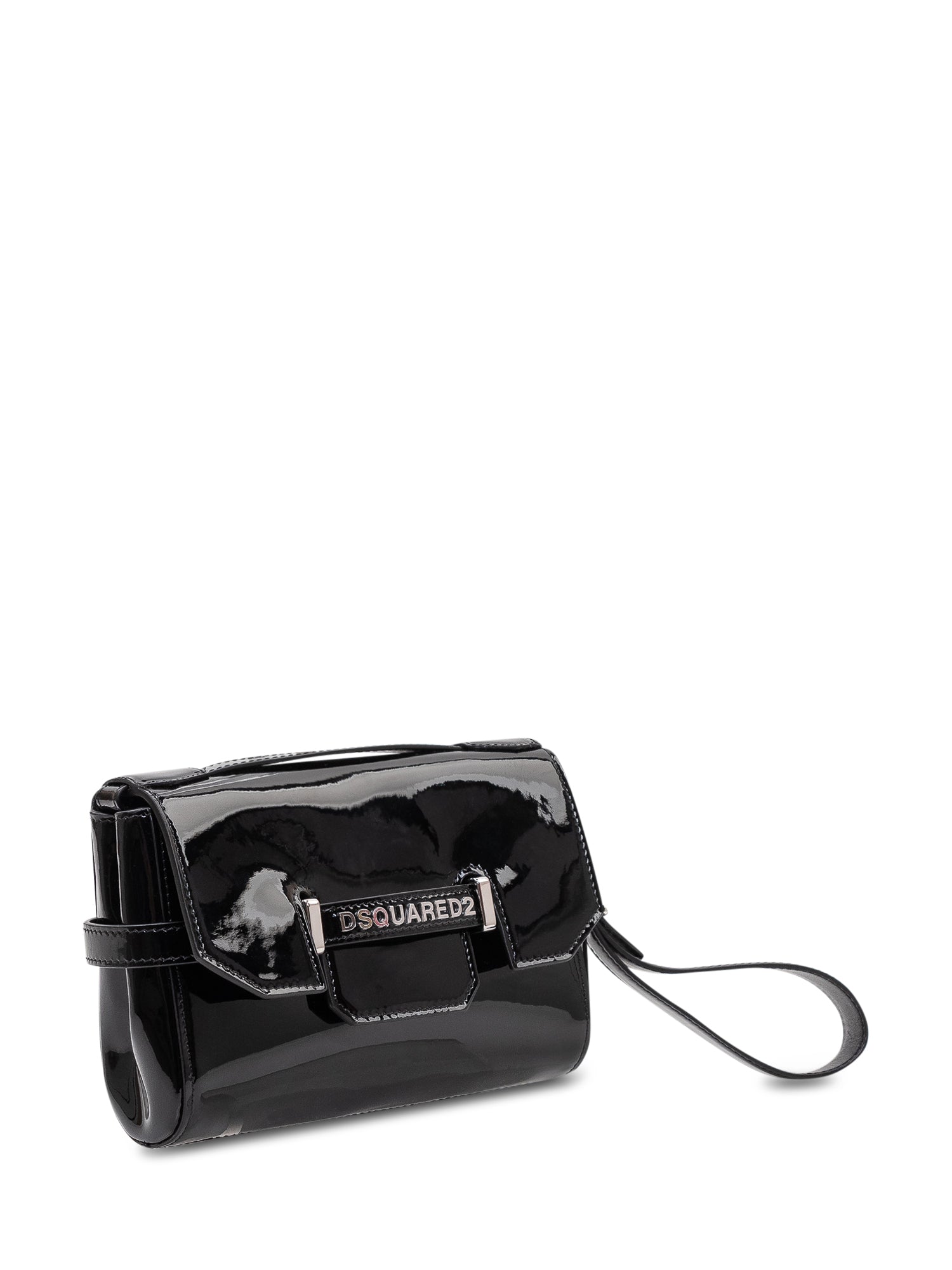 Stylish patent leather clutch featuring a structured front flap, DSQUARED2 metal logo closure detail, and a practical removable wrist strap.