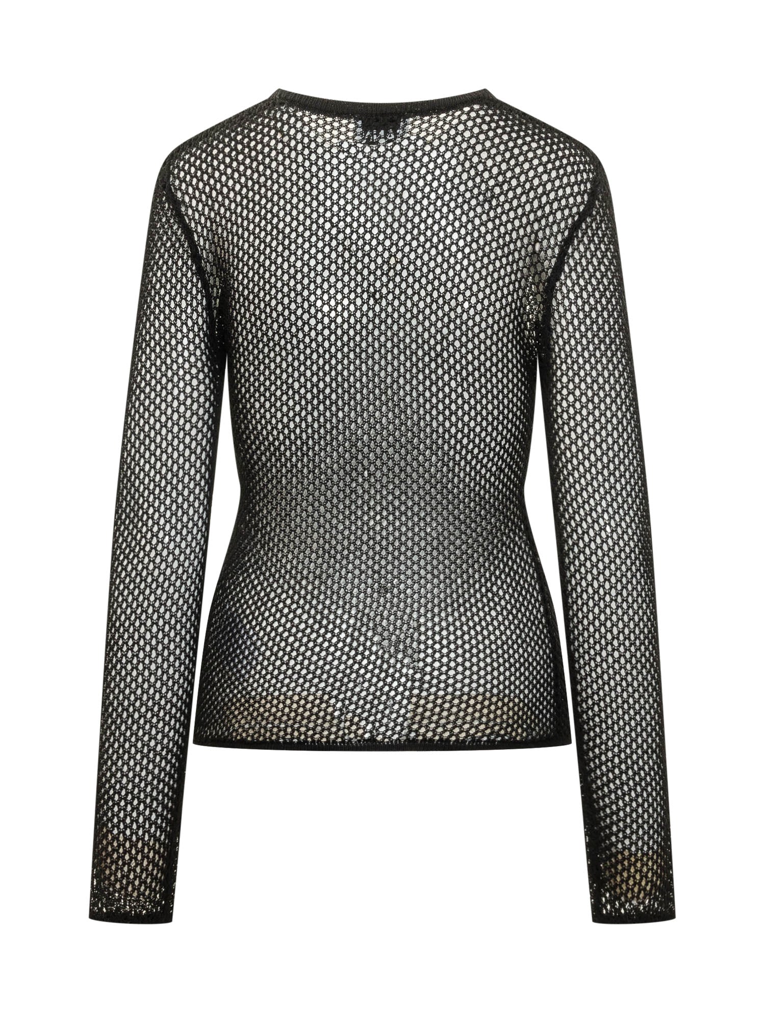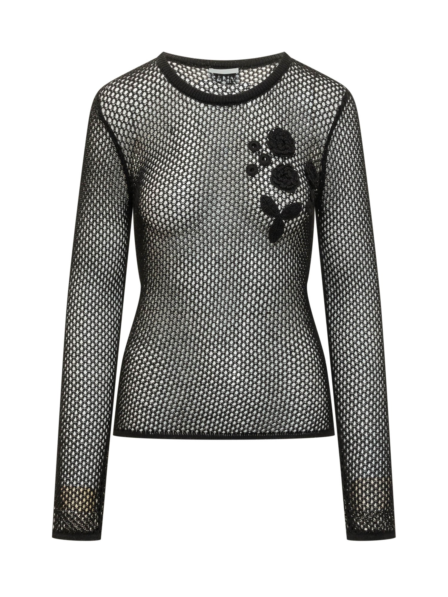 Long sleeve mesh T-shirt with crew neck, openwork texture and floral appliqué on the front