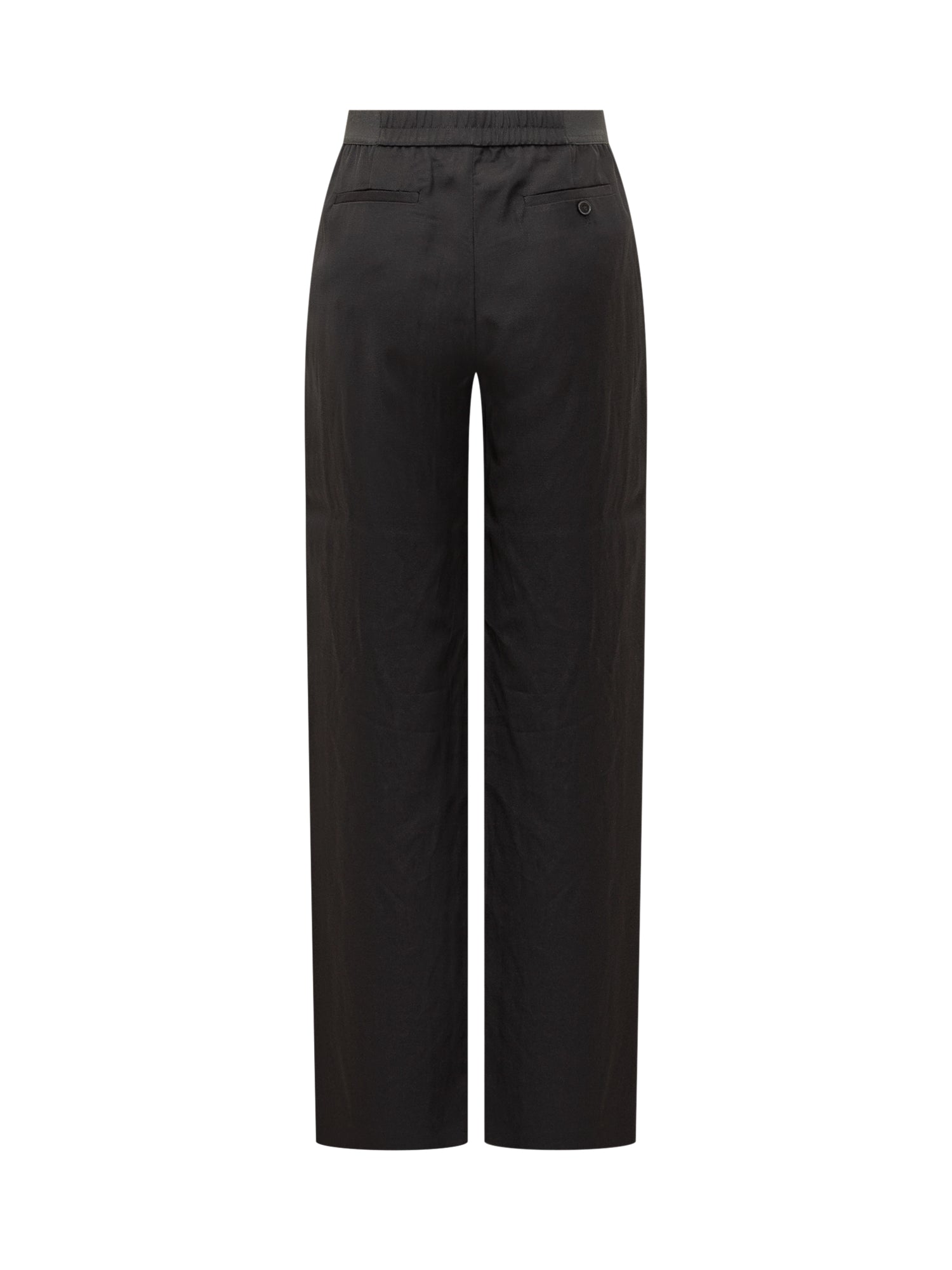 Black long pants. Elastic waist. Slant pockets. Welt pockets on the back. Wide leg.
