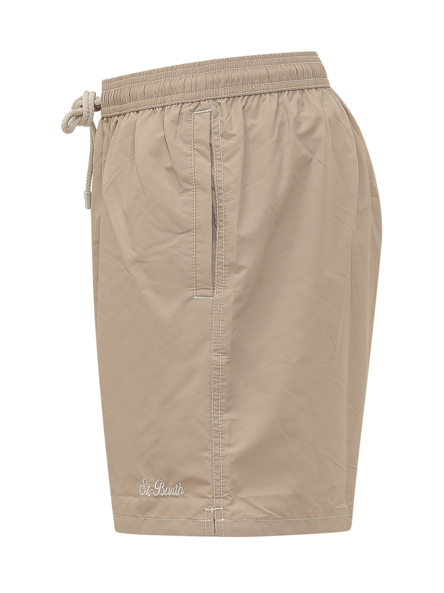 Men s swim shorts with an elastic waistband and adjustable drawstring. Made from lightweight quick-drying fabric, featuring contrast stitching and an embroidered logo at the hem, perfect for a clean and refined summer style.