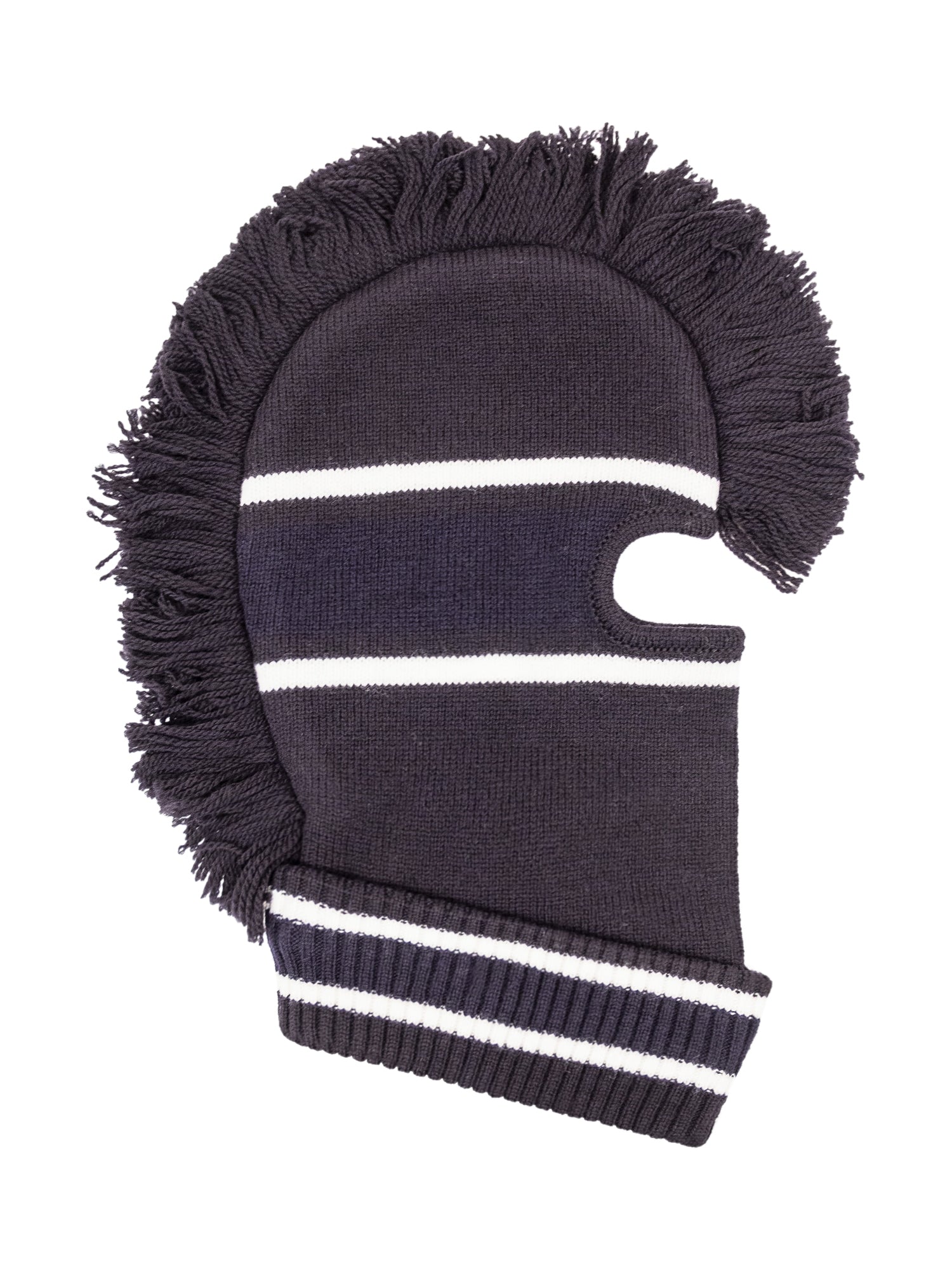 Balaclava nero in lana. Logo ricamato. Dettagli a contrasto. Fondo a costine. Frange sul bordo.
