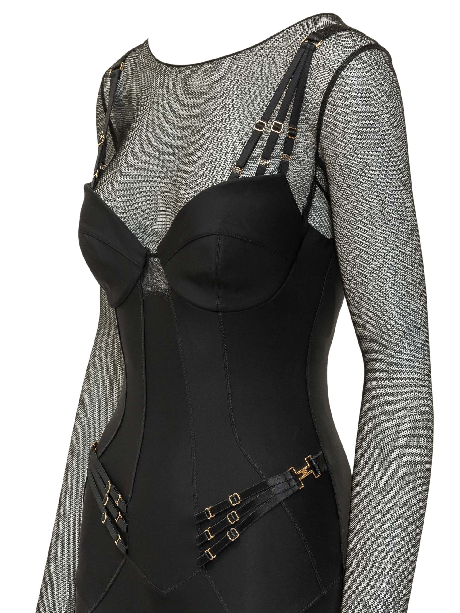Full-length jumpsuit featuring a sculpted bodice, mesh sleeves and decorative buckle straps. Body-hugging fit enhances the silhouette.