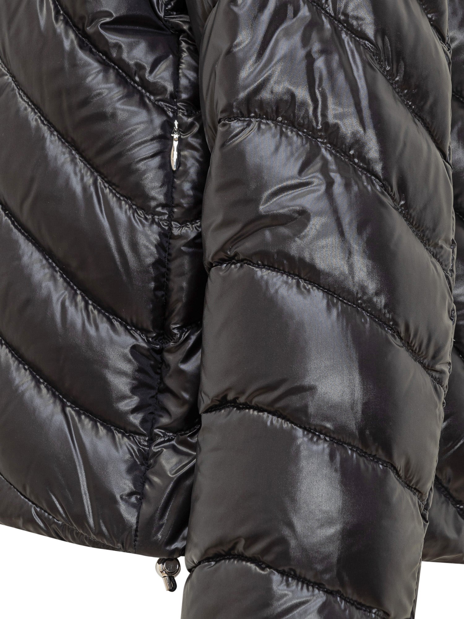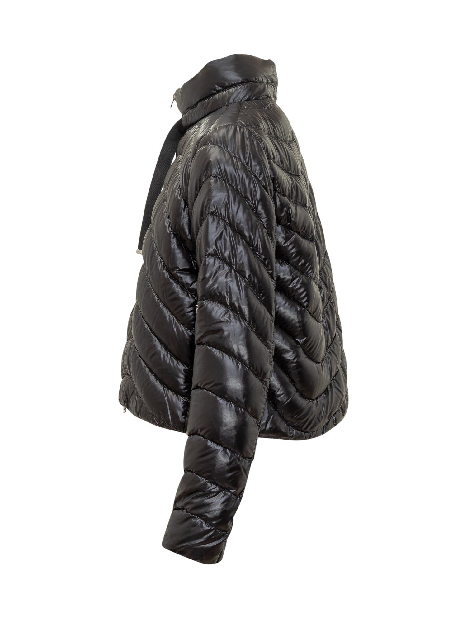 Herno women's short down jacket in shiny black technical fabric with wave quilting, double-slider zip and high neck with drawstring.