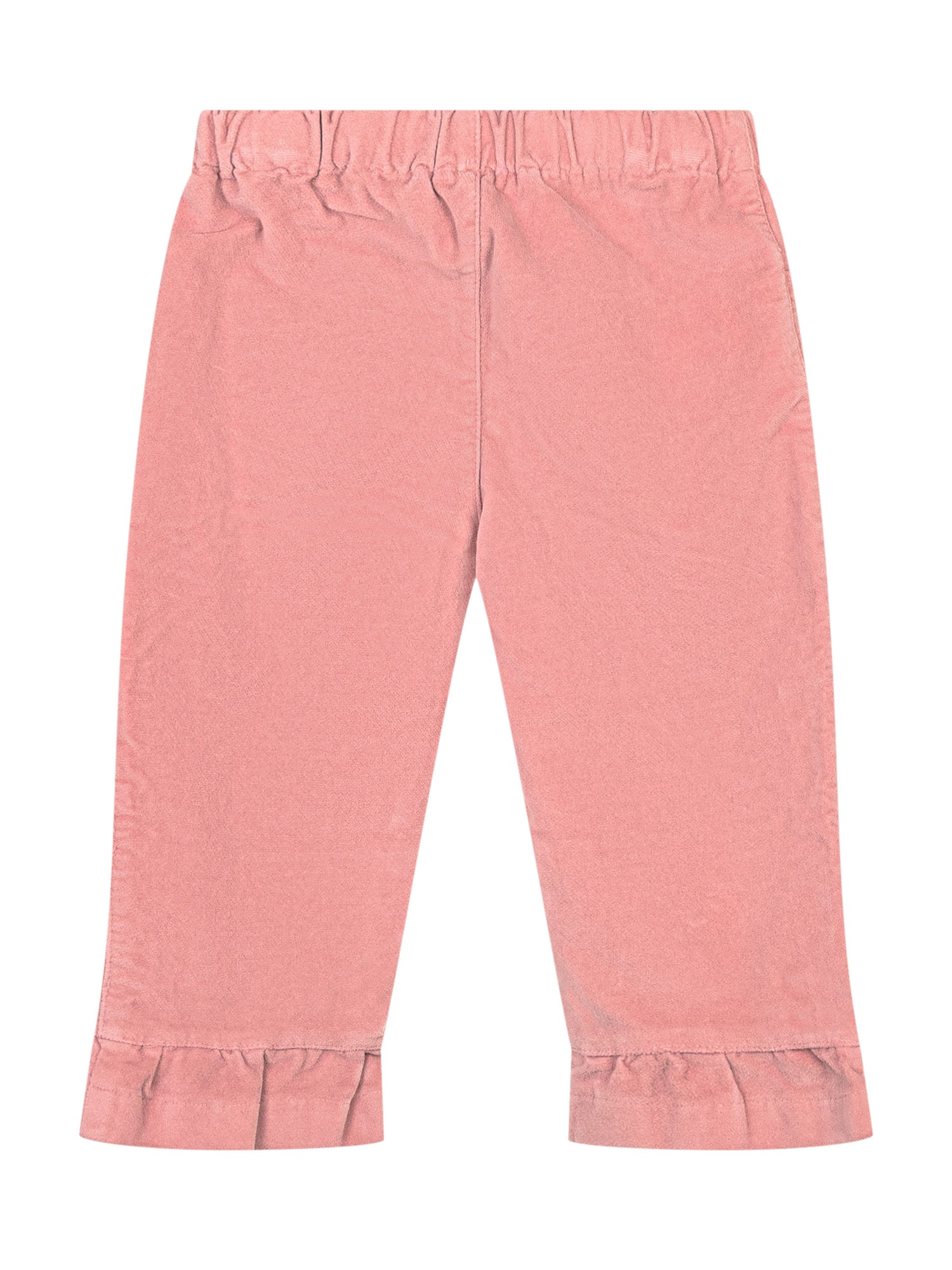 L Orso Bruno pink corduroy pants with elastic waist and ruffled hem.