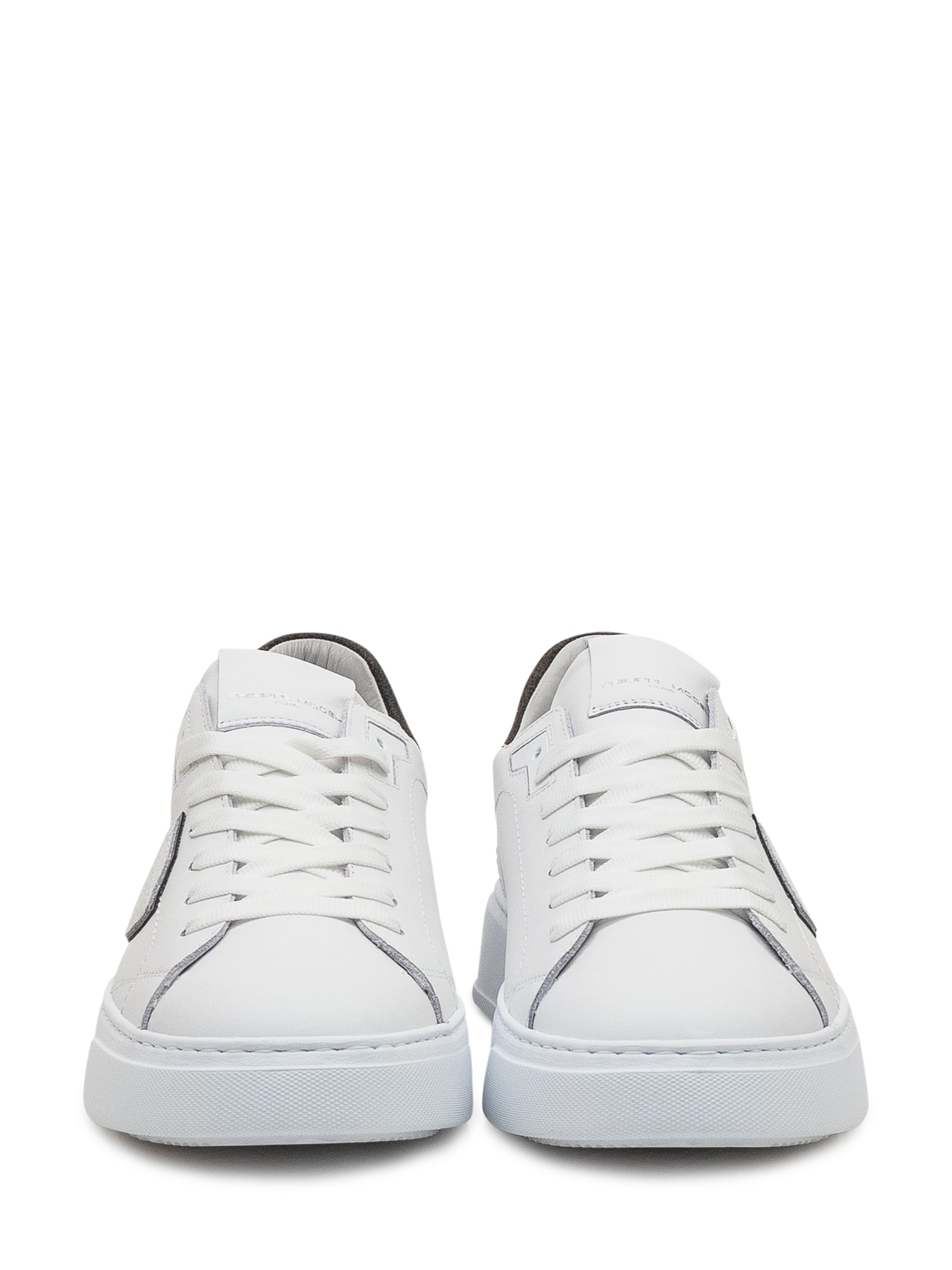 Philippe Model sneakers in white leather with a black cracked leather detail on the heel. Stitched shield logo on the side and thick white sole.