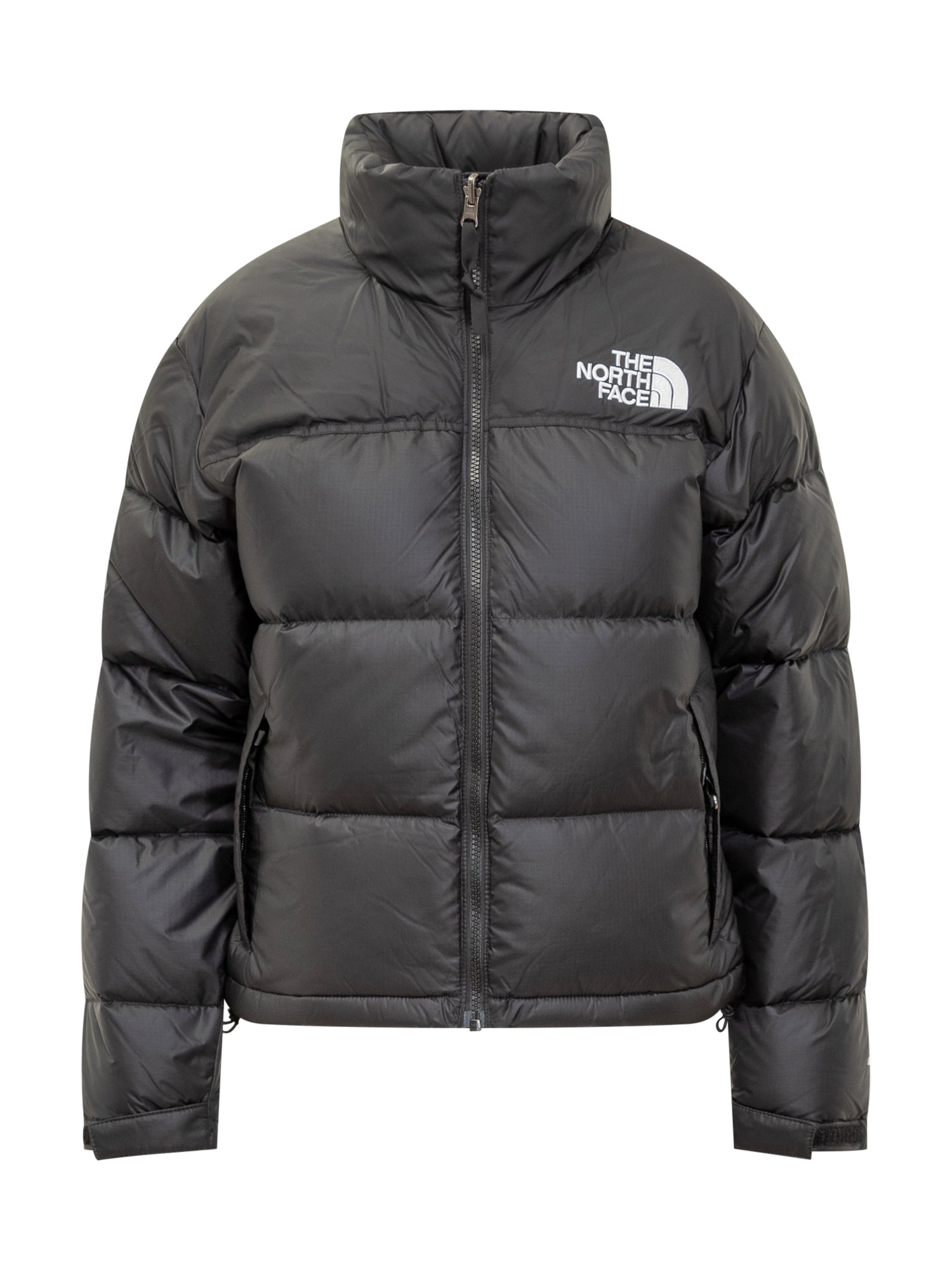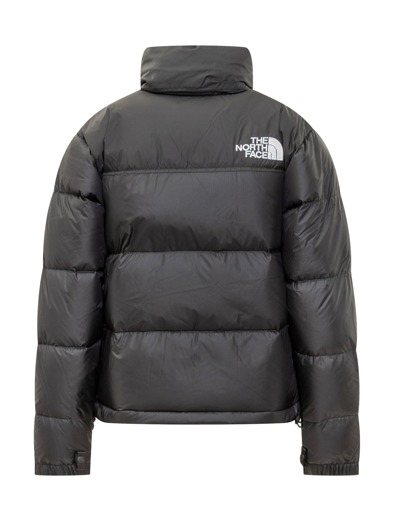 The North Face Nuptse down jacket in black nylon with warm lightweight padding. Embroidered logo on chest and back, front zip, side pockets and adjustable cuffs.