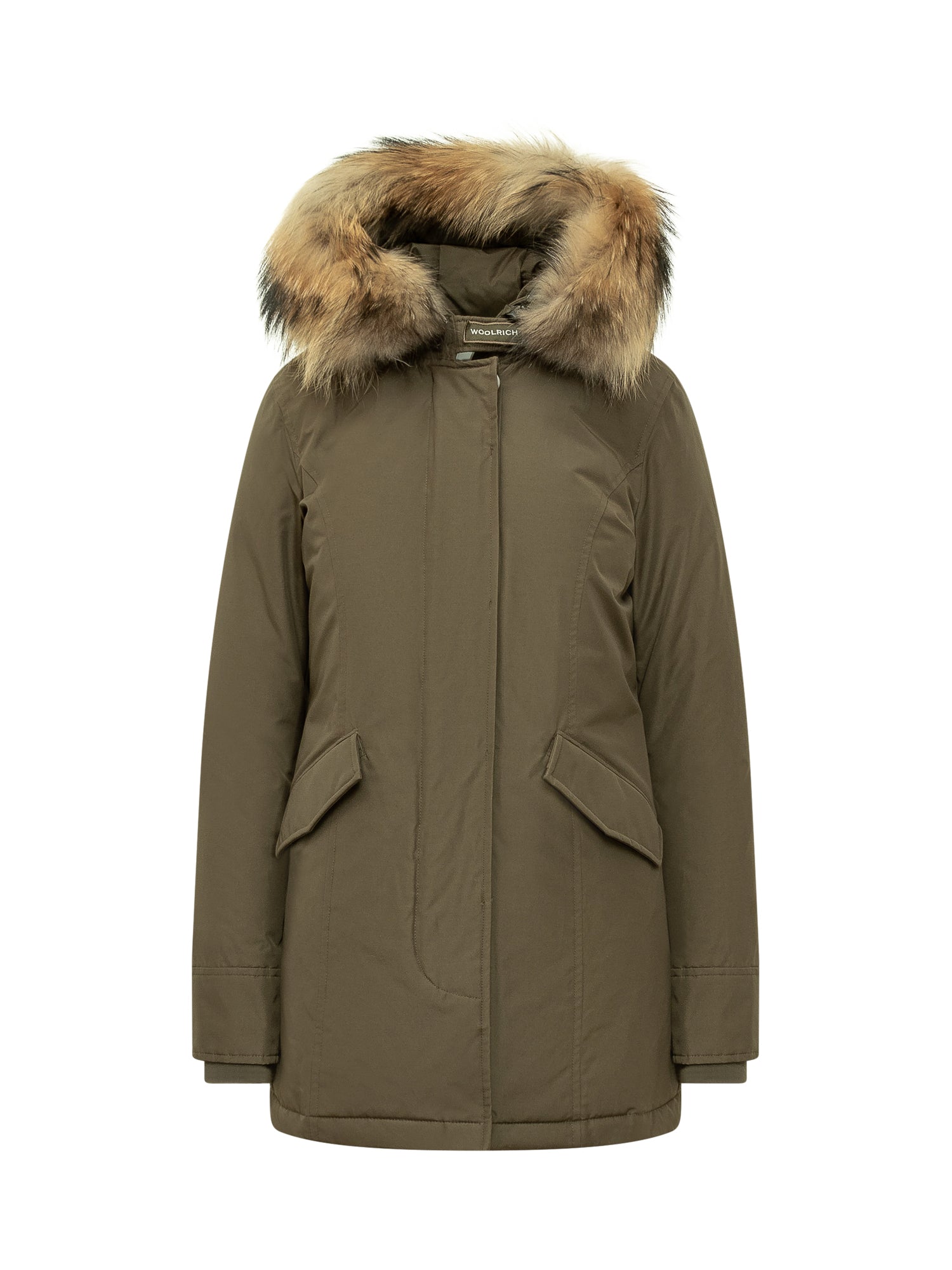 Green padded parka. Fur hood. Flap pockets. Zip closure.