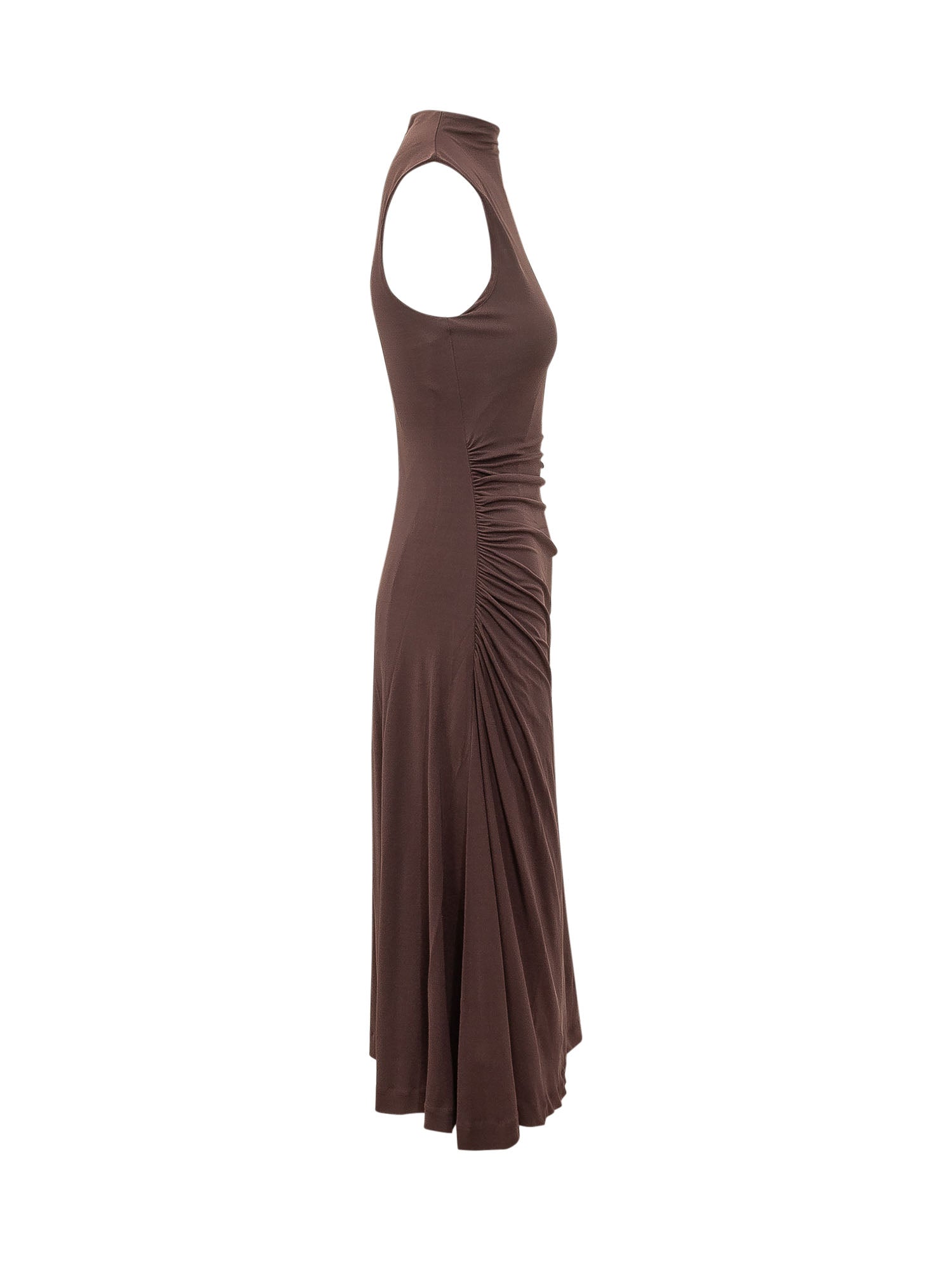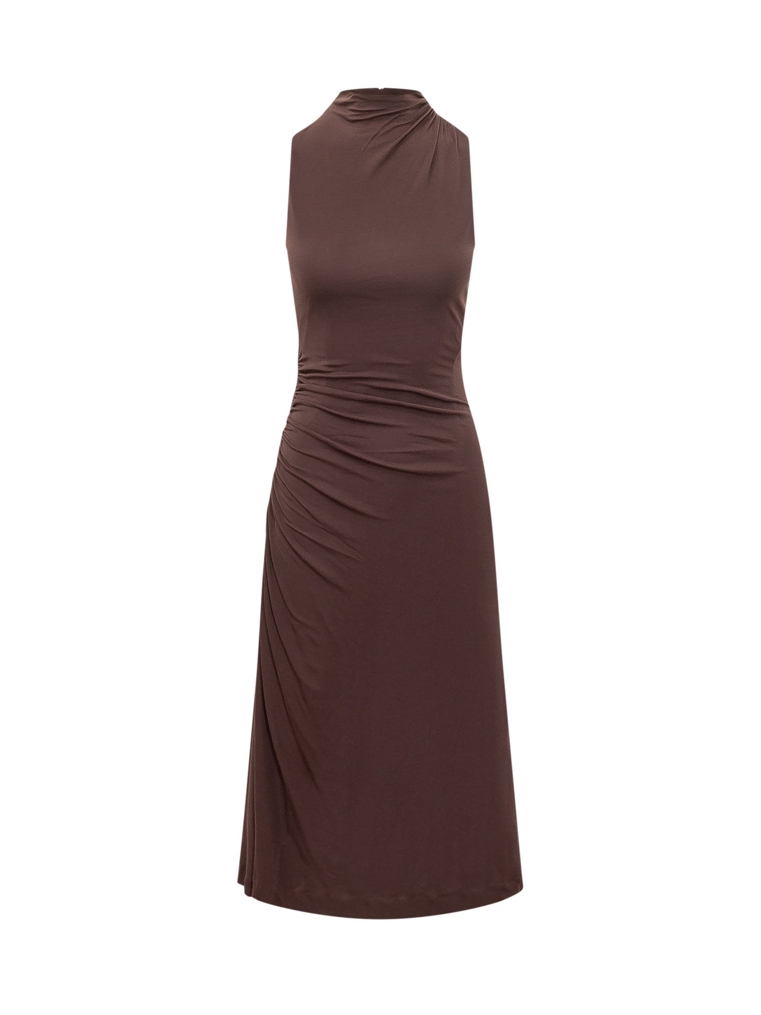 Sleeveless midi dress featuring high neck and draped detail on the side.